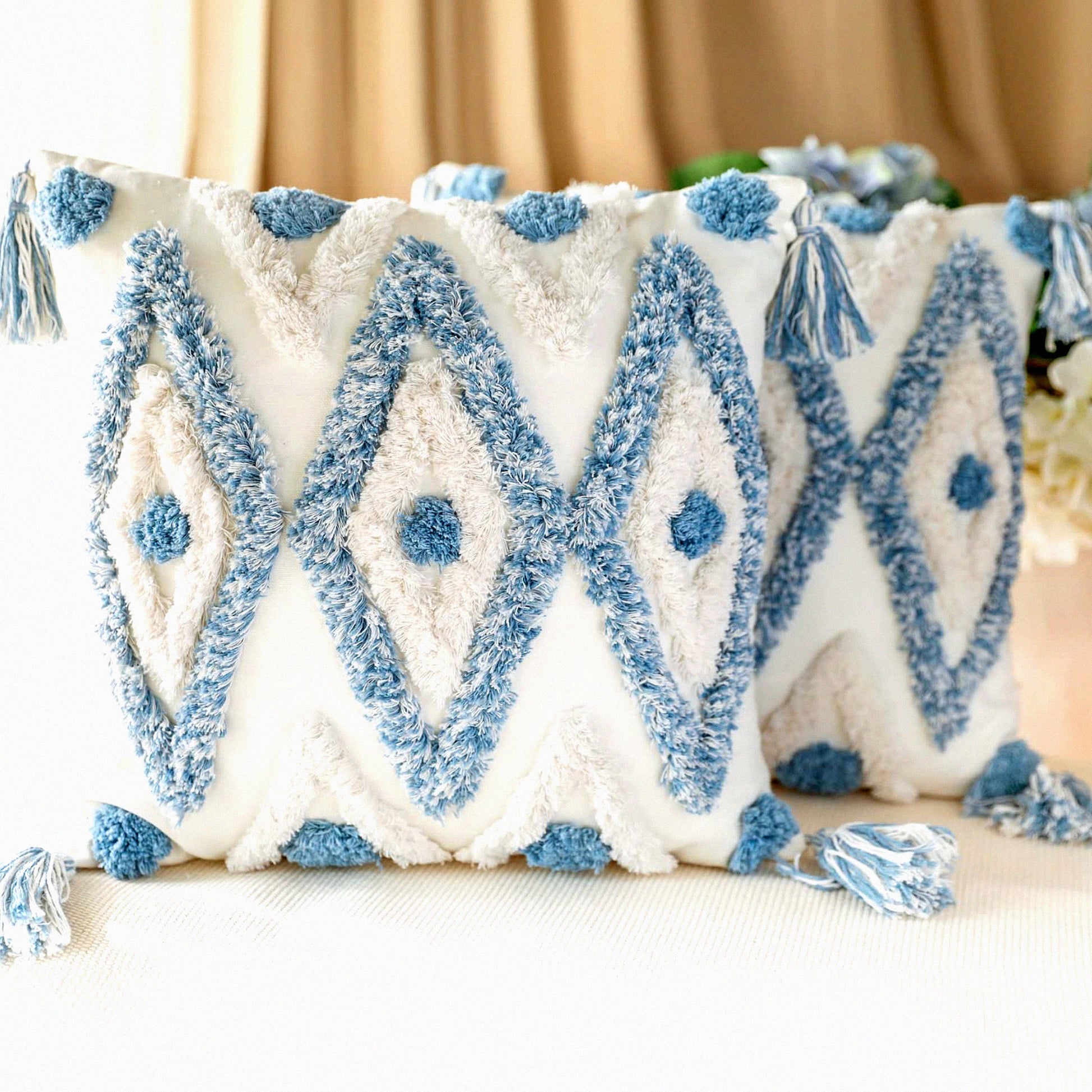 Boho Chic Tufted Tassel Pillow Covers - Set of 2 Decorative Square Pillowcases for Couch Sofa Bed, Farmhouse Living Room - 18x18 Inch Blue