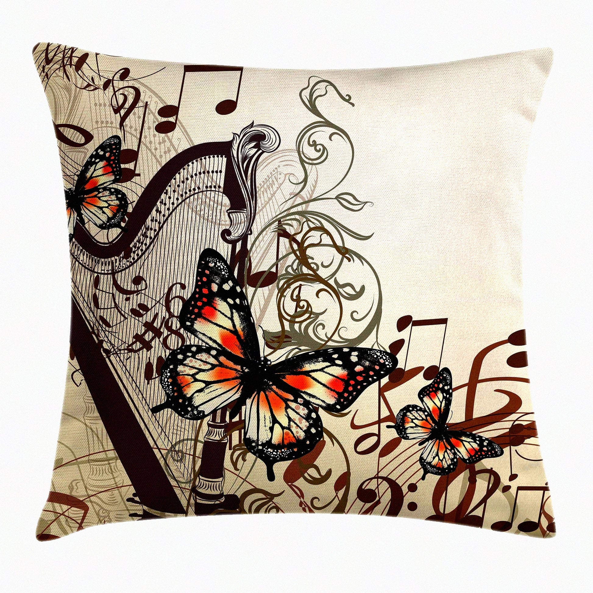 Musical Butterfly Harmony Pillow Cover - Decorative Square Accent Case for Concert Theme Decor, 16" X 16", Cream Orange Black