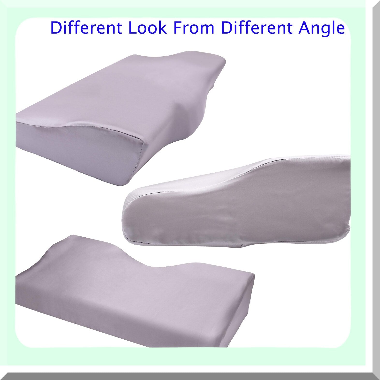 The silk pillowcase is designed specifically for an orthopedic sleeping pillow, made from pure mulberry silk. It is tailored for an ergonomic cervical pillow, with a contour memory foam pillow in mind. The dark grey pillowcase measures 24" x 15" x 4.7"/2.5". The practical benefits include improved comfort and support for orthopedic and cervical pillows, as well as the luxurious feel of mulberry silk. The pillowcase enhances the overall sleeping experience by providing a smooth and soft surface for the user. It also helps to maintain the shape and integrity of the pillow, extending its lifespan.