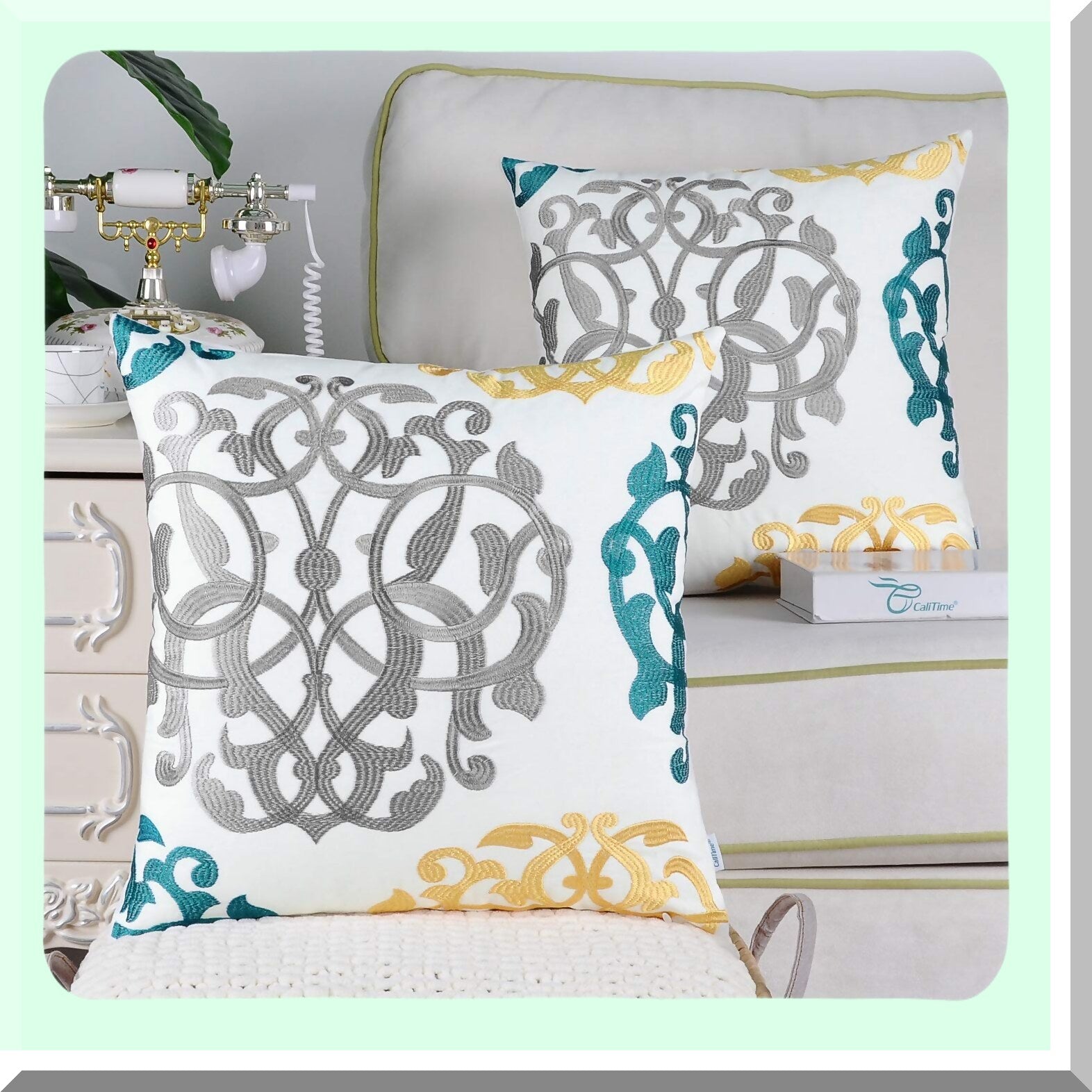 Vintage Geometric Floral Embroidered Throw Pillow Covers - Set of 2 Cotton Cushion Cases for Couch Bed Sofa - Farmhouse Decor 18x18 Grey/Teal/Gold