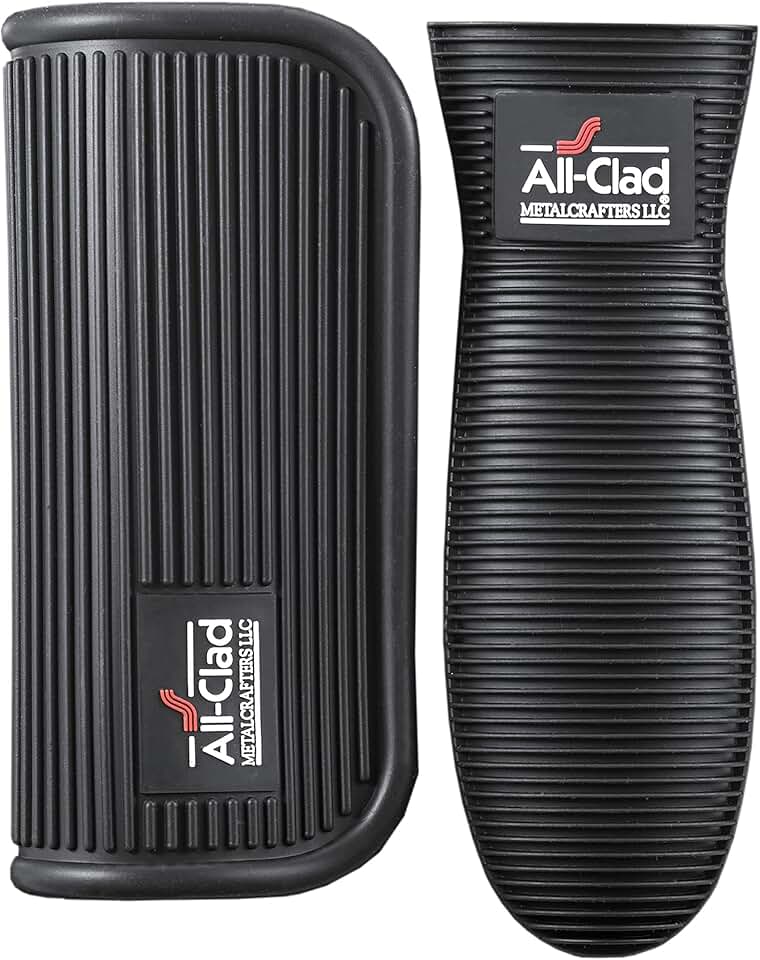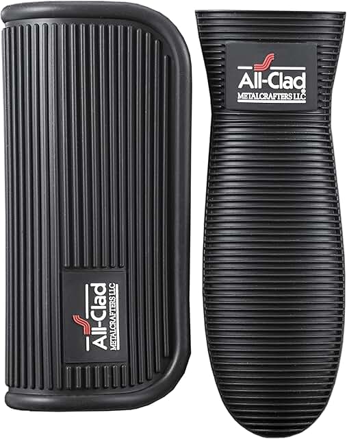 This set includes two flexible silicone grips designed to provide a secure hold on cookware. Made from heat-resistant silicone, they are suitable for use with cast iron, steel, or glass pots and pans. The grips feature a ribbed surface for added grip and comfort. Their flexible design allows for easy fitting and removal. The set comes in black and grey colors, offering a simple and practical solution for handling hot cookware safely.