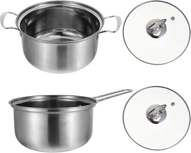 This set includes two stainless steel cooking pots designed for preparing noodles, soups, and sauces. Each pot features a pour spout for easy pouring and handling. Made from durable stainless steel, these pots are suitable for everyday kitchen use. They are ideal for preparing family meals and offer a practical solution for cooking and serving a variety of dishes.
