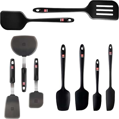 This 9-piece silicone kitchen utensil set includes flexible turners and seamless spatulas designed to withstand temperatures up to 600°F. The utensils are made from nonstick, BPA-free silicone that is safe for use with nonstick cookware. They are flexible and durable, making them suitable for baking and cooking tasks. The set is seamless, ensuring easy cleaning and preventing food from getting trapped. The utensils are also LFGB certified, indicating they meet safety standards.