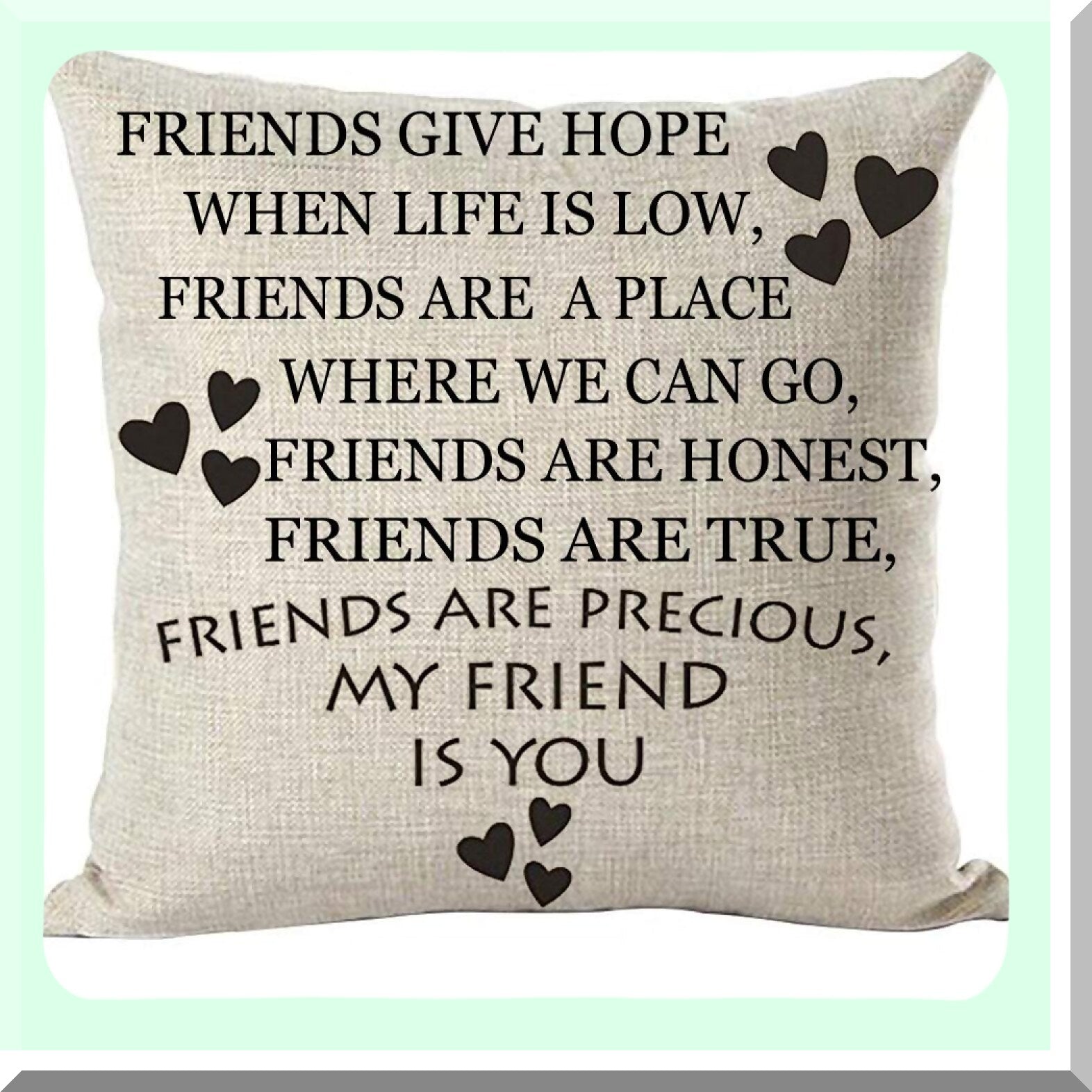 This decorative throw pillow cover, made from cotton linen, measures 18 x 18 inches (45 x 45 cm) and may have a 1-2 cm size variation. It features an inspirational word art quote about friendship, making it a meaningful and stylish addition to home decor. The cover's design emphasizes the value of friends, offering both aesthetic appeal and a heartfelt message.