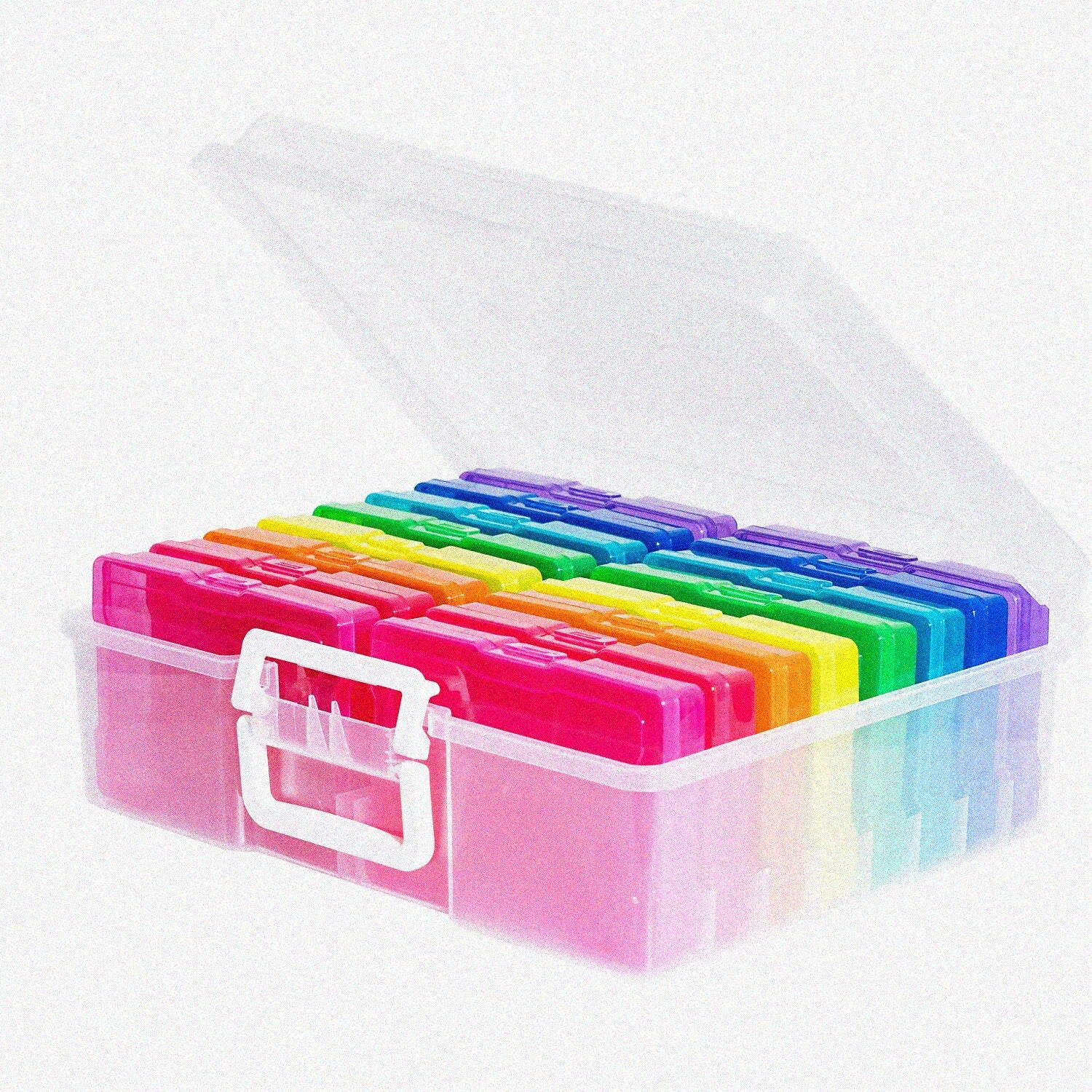 This storage container box features an outer dimension of 12.0"L x 14.8"W x 5.1"H and includes 16 multi-colored inner cases measuring 4.75"L x 6.70"W x 1.23"H. Designed to maximize space, these containers can be placed in bookcases, drawers, or desktops, making organization simple and efficient. They are ideal for sorting and storing important documents, photos, children's puzzles, or small supplies by occasion. The in-molded handle allows for easy transportation, enabling you to carry your items conveniently wherever needed. The multi-colored design adds a vibrant touch to your storage solutions, helping you quickly identify and access your stored items. Durable and versatile, these plastic storage container boxes are perfect for keeping your space tidy and organized. Whether for home, office, or classroom use, they provide a practical solution for managing small items with ease.