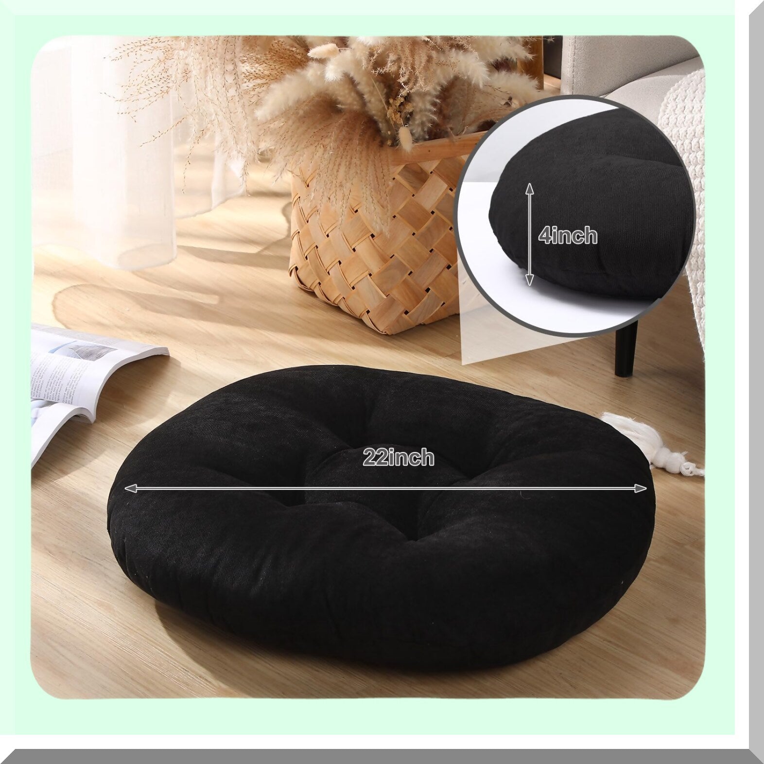22-Inch Round Corduroy Floor Cushions - Set of 2 | Large Circle Chair Pillows for Tatami Sofa, Living Room, Outdoor Seating | Black Round Cushion for Floor Sitting