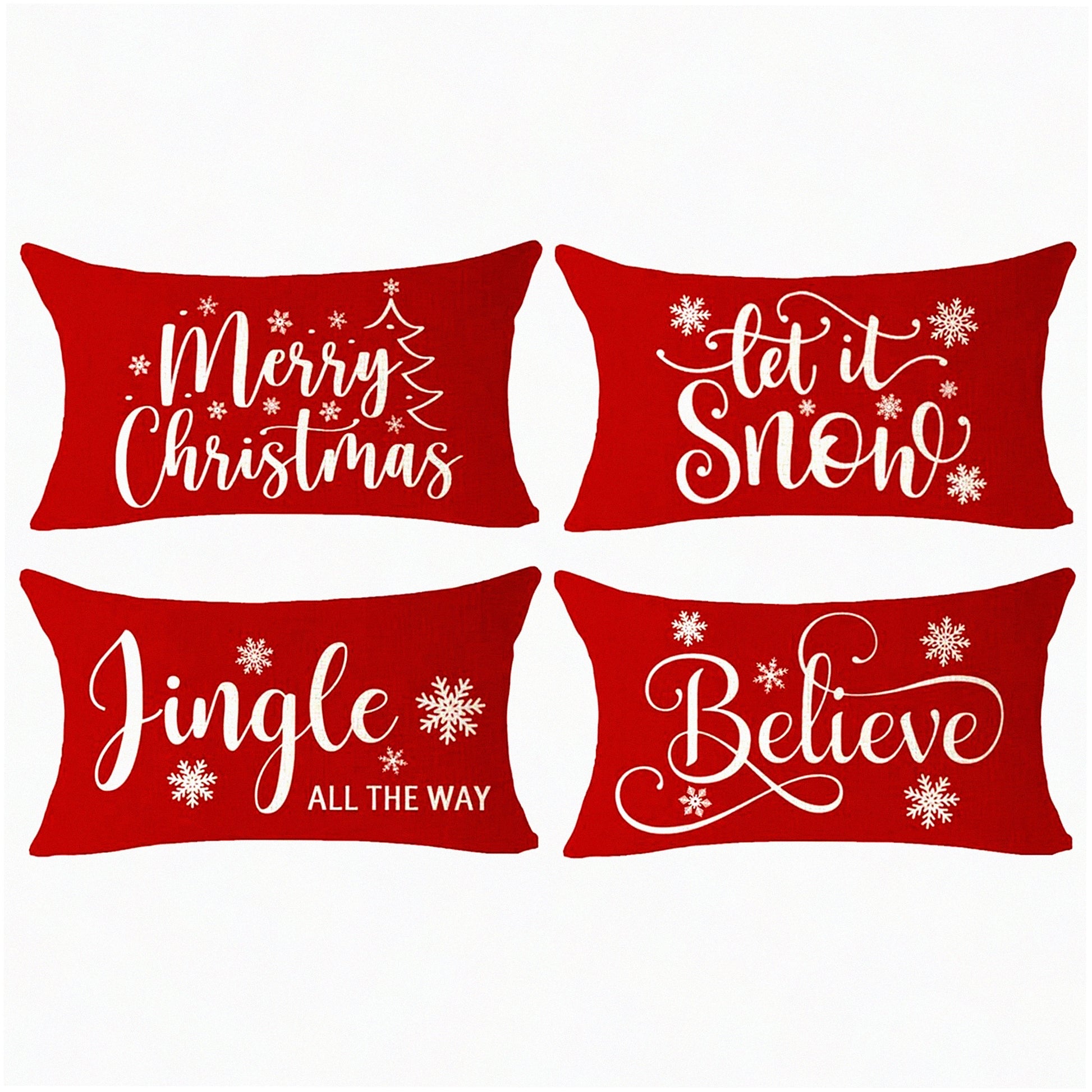 Winter Wonderland Festive Pillow Covers - Snowflake Decor Let It Snow Jingle All The Way Believe Lumbar Cushion Case for Sofa Home Decor - 12x20 Inches Cream and Red Cotton Linen