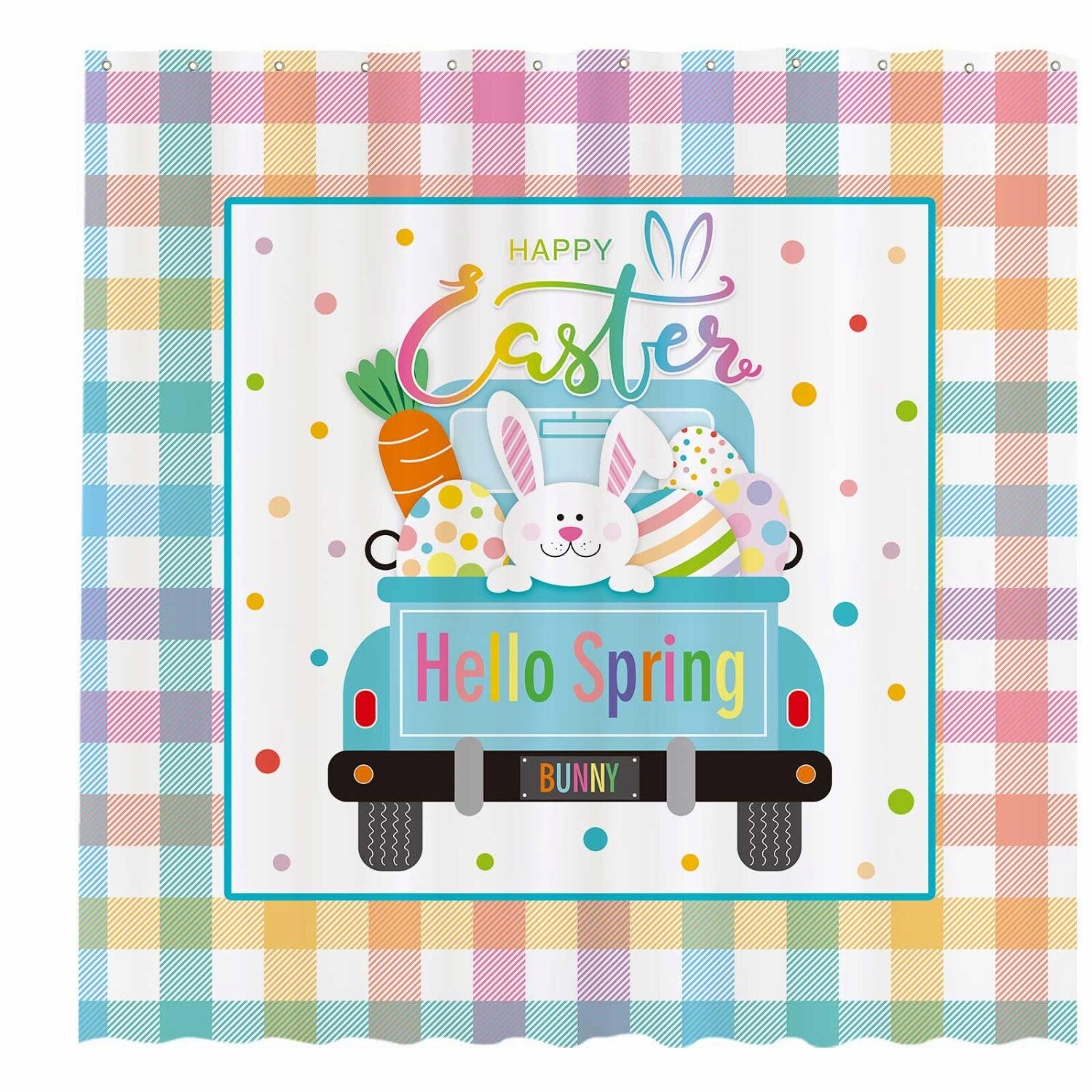 This 72" x 72" shower curtain features a colorful spring buffalo check plaid design with playful bunny rabbits, adding a cheerful touch to any bathroom. Made from lightweight, durable polyester fabric with a waterproof coating, it effectively keeps water inside the shower and prevents splashes. The curtain is designed with 12 metal buttonholes (hooks not included) for easy installation. Its HD graphic designs utilize color-fast technology, ensuring vibrant, eco-friendly prints that resist fading and odors. Suitable for various uses, it can serve as a bathroom curtain, room divider, or door cover, making it a versatile addition to homes, hotels, dorm rooms, or other spaces. The curtain is machine washable on a cold water cycle and dries quickly, maintaining its appearance and functionality over time. Its tearproof, waterproof, and easy-care features make it a practical choice for everyday use.