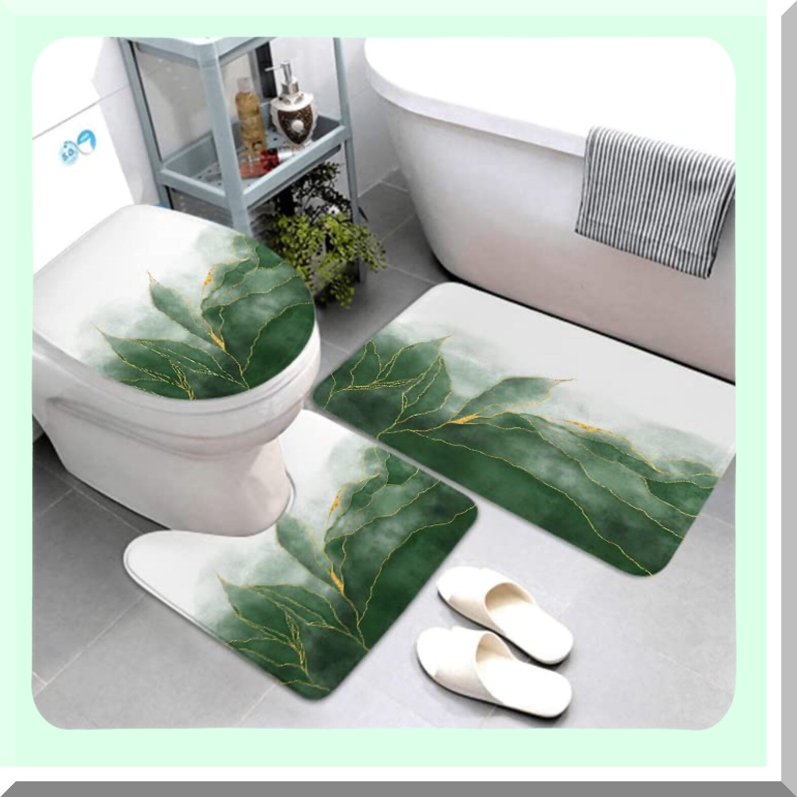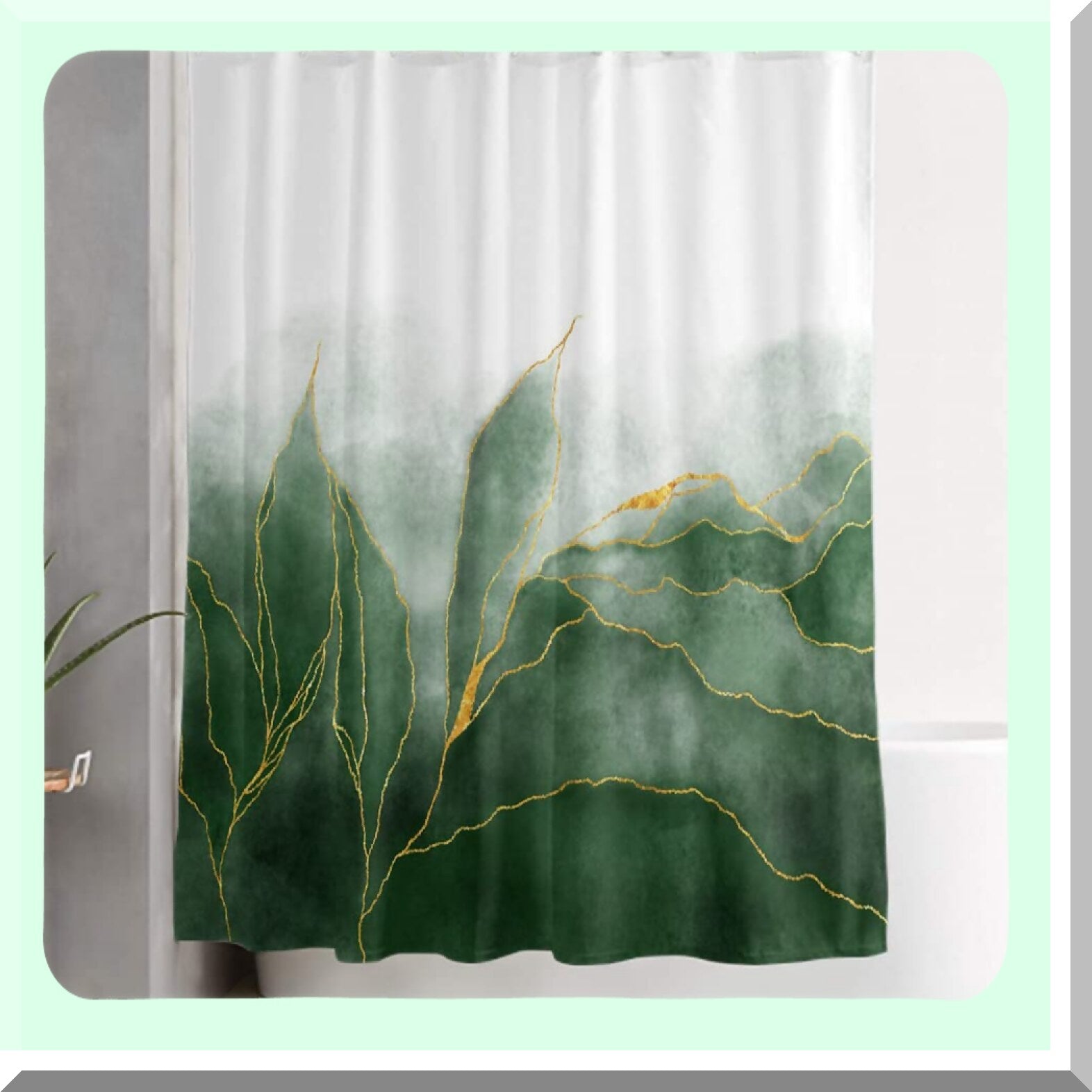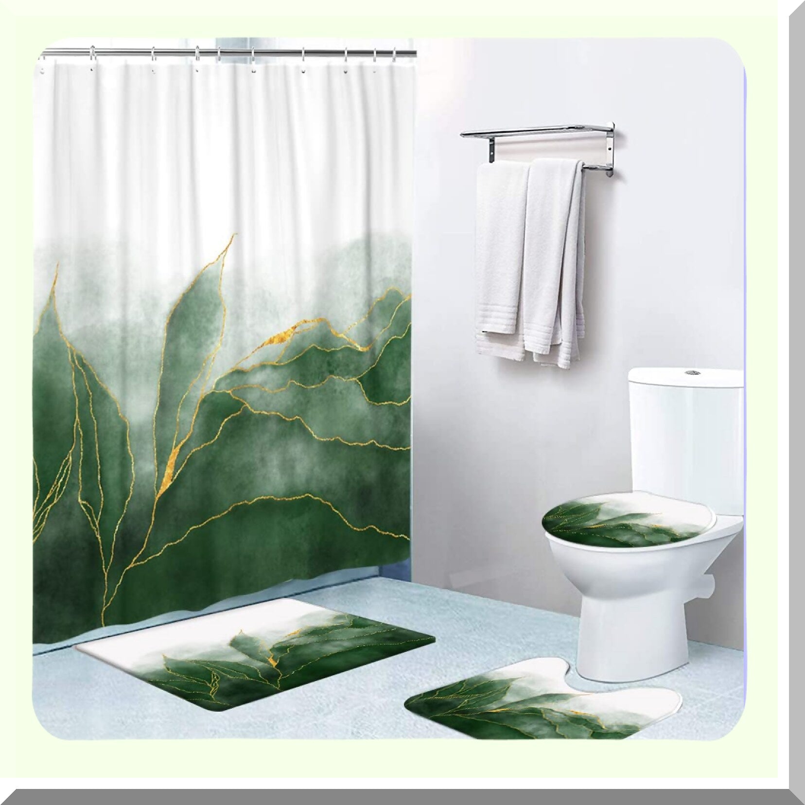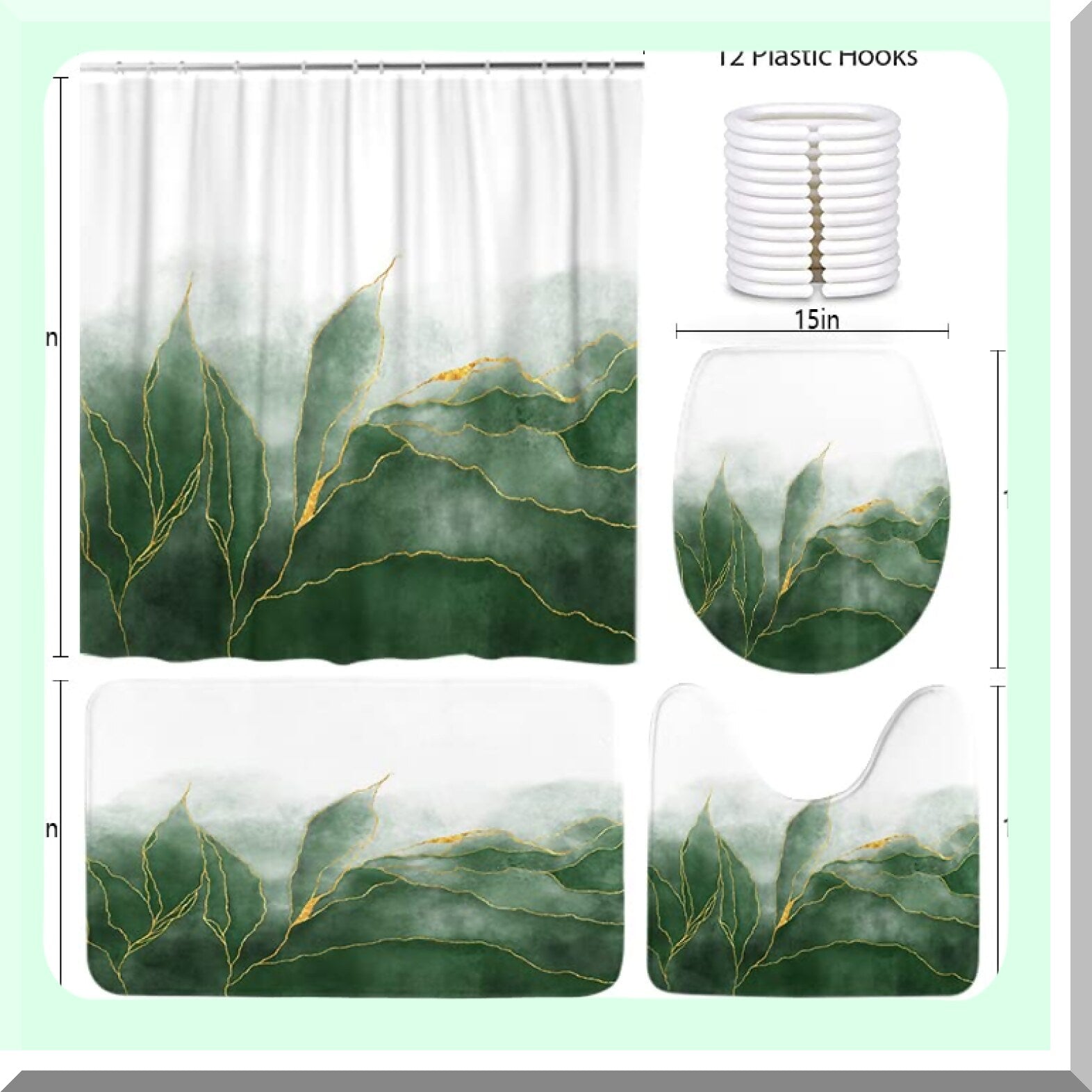 This bathroom set includes a 72" x 72" waterproof shower curtain featuring green paint with golden shiny veins, along with 12 durable hooks for easy hanging. The set also contains a soft, high-quality bathroom mat measuring 18" x 30", a U-shaped rug 16" x 20", and a tet lid cover 17" x 15". Made from soft polyester, the shower curtain offers durability and waterproof protection, while the bathroom rug is crafted from thickened flannel with anti-slip properties. Advanced HD digital printing ensures clear, natural patterns, and environmentally friendly ink guarantees no odor or health risks. The set is easy to install with included hooks and is quick-drying for convenience. Care instructions recommend hand or machine washing in cold water, avoiding bleach. Please note color differences due to lighting and screen effects, and that product sizes may vary slightly due to manual measurement. Vacuum compression may cause initial size and thickness changes, which will restore over about a week.