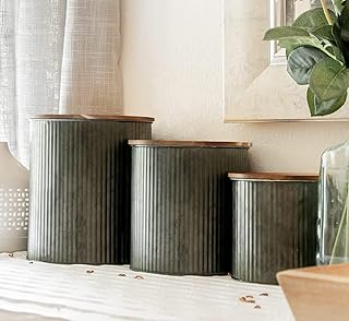 Set of farmhouse-style kitchen canisters designed for countertop use, available in approximately 5, 4, and 2-quart sizes. Crafted from durable acacia wood, these tin canisters feature a rustic, natural appearance that complements farmhouse and modern decor themes. Ideal for storing dry goods such as flour, sugar, coffee, or tea, they help keep your kitchen organized and add a warm, inviting touch to your space. The canisters are designed with secure lids to maintain freshness and prevent spills. Their versatile sizes make them suitable for various storage needs, while the natural wood finish enhances the rustic charm of your kitchen or home decor. These canisters are easy to clean and maintain, making them a practical and stylish addition to any countertop. Perfect for those who appreciate a blend of rustic and contemporary aesthetics in their home.