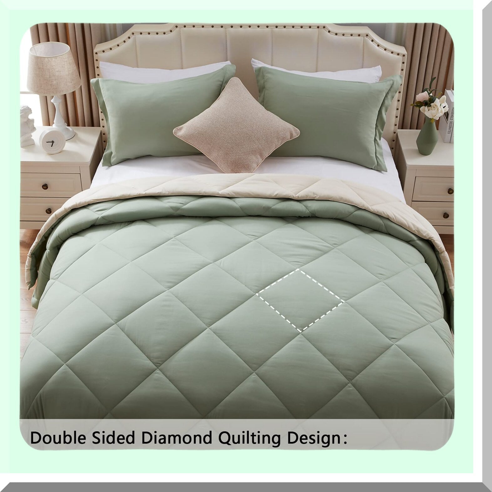 UltraLight Reversible Comforter Set - Thin Microfiber Bedding with 2 Pillow Sham - Summer Sage Green/Beige - Queen Size - Down Alternative
