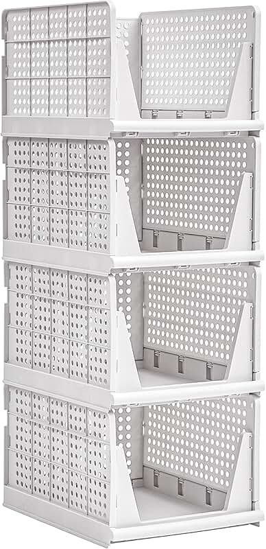 This set includes four plastic closet shelf organizers designed for versatile storage. Each unit is stackable, allowing for customizable arrangements to maximize space. The foldable design makes it easy to expand or collapse the organizers as needed. Constructed from durable plastic, these organizers are suitable for use in closets, bathrooms, and kitchens. They provide a practical solution for storing sweaters, clothing, accessories, or household items. The lightweight design ensures easy handling and installation, while the space-saving feature helps keep areas tidy and organized. The neutral gray color complements various interior styles, making them a functional addition to different spaces. These organizers are ideal for creating a neat and accessible storage system in any room. Their simple assembly process allows for quick setup, making them a convenient choice for improving organization and optimizing storage space.