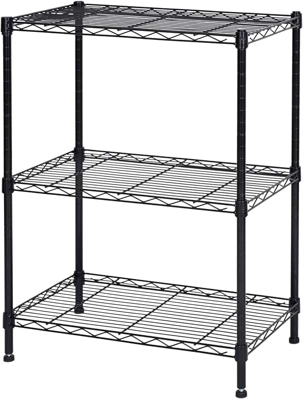 This 3-shelf storage rack features adjustable height metal shelving, providing versatile storage options for various spaces. Its sturdy construction ensures durability and stability, making it suitable for organizing items in the garage, kitchen, office, pantry, or other areas. The wire rack design allows for good airflow and visibility of stored items. With a compact footprint measuring 13.5 inches deep, 23.4 inches wide, and 31 inches high, it maximizes storage capacity without taking up excessive space. The adjustable shelves enable customization to accommodate different item sizes, helping to keep spaces tidy and organized. Ideal for heavy-duty storage needs, this shelving unit offers a practical solution for home and workspace organization. Its durable metal frame ensures long-lasting use, making it a reliable addition to any storage area.