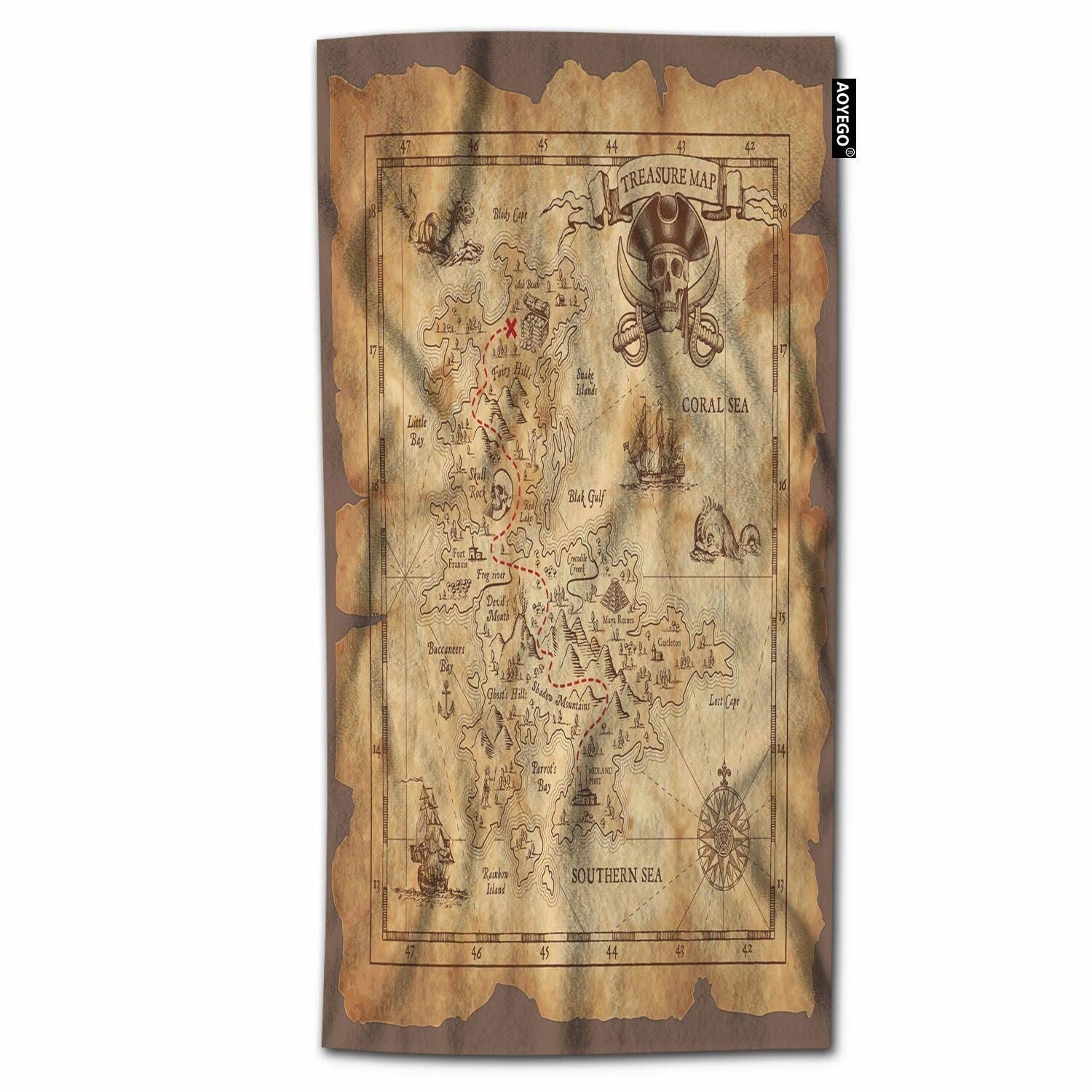 This bath towel features a detailed treasure map design with a pirate skull and a ruined old parchment island scene. Measuring 64x32 inches, it is made from soft polyester-microfiber material, providing a comfortable and absorbent experience. Its decorative pattern adds a touch of adventure and old-world charm to any bathroom, beach, or home setting. The vibrant print and high-quality fabric make it suitable for everyday use or as a decorative piece. Perfect for those who enjoy nautical or pirate-themed decor, this towel combines functionality with a distinctive design. Its generous size ensures full coverage and quick drying, making it ideal for bath or beach use. Enhance your space with this unique, adventure-inspired towel that brings a sense of exploration and old-world mystery to your daily routine.