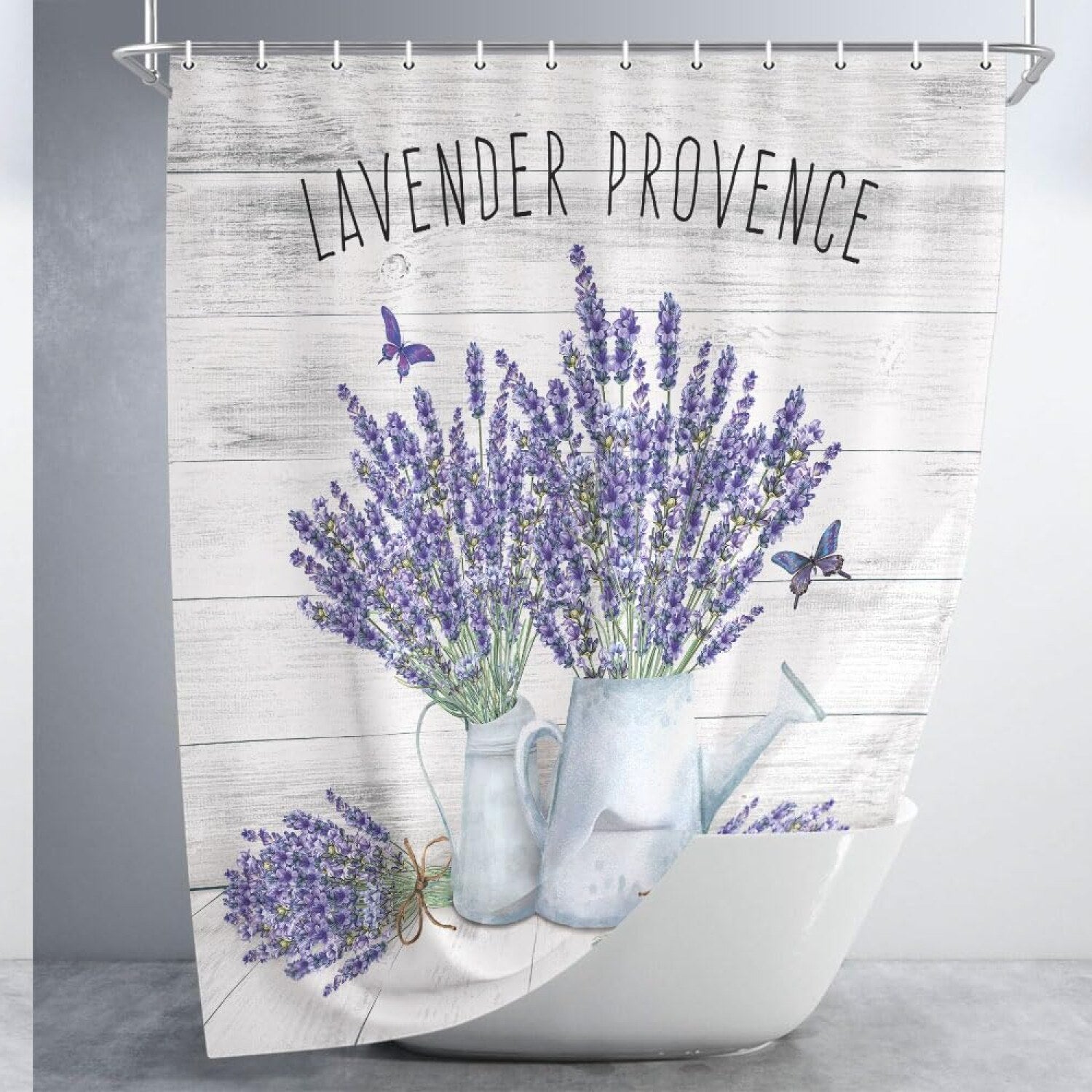 This lavender rustic shower curtain features a beautiful purple floral design with butterflies, herbs, and leaves displayed on a farmhouse wooden board background. Crafted from lightweight polyester fabric, it offers durability, waterproof protection, and quick-drying properties. The high-definition 3D printed image adds a stylish touch, transforming your bathroom into a more inviting space. The curtain measures 72 inches by 72 inches and includes plastic hooks for easy installation. Its farmhouse-inspired design provides a fresh, charming look that instantly upgrades your bathroom decor. Easy to care for, it can be machine washed or hand washed in cold water, making maintenance simple. Perfect for adding a rustic, floral touch to your bathroom, this fabric shower curtain combines practicality with aesthetic appeal, creating a cozy and stylish environment.