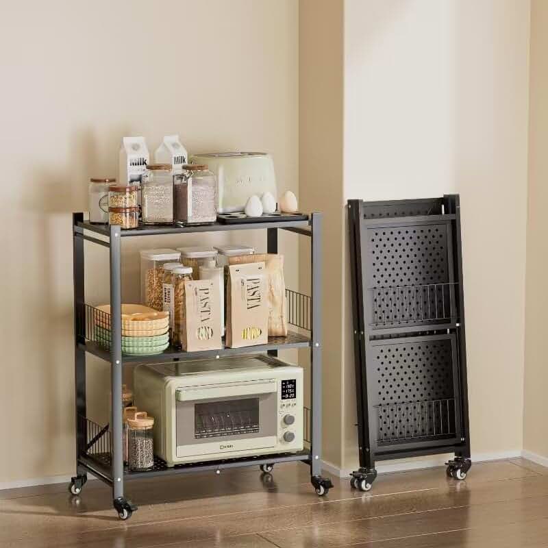 This 3-tier folding storage shelf offers versatile organization for various spaces. Made from durable metal, it features three spacious shelves to hold kitchen supplies, pantry items, tools, or household essentials. The shelves are designed to be foldable, allowing for easy setup and compact storage when not in use. Equipped with rolling wheels, the unit can be moved effortlessly across different areas, making it ideal for kitchens, warehouses, patios, basements, or pantries. Its sturdy construction ensures stability and support for a variety of items. The black finish provides a sleek, modern look that complements different decor styles. No assembly is required, enabling quick and convenient setup. The collapsible design enhances portability and space-saving capabilities, making it suitable for both temporary and long-term storage needs. This versatile shelving unit combines practicality with ease of use, helping to organize and maximize space efficiently.