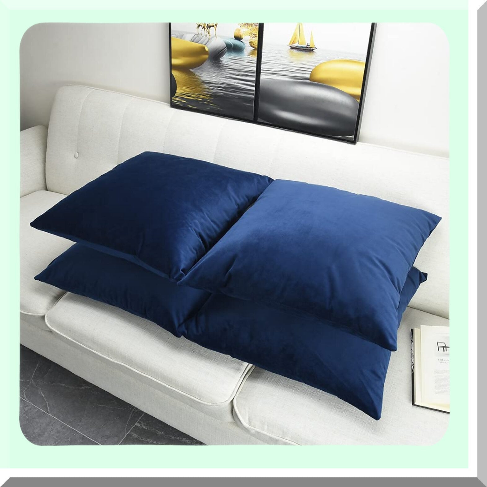 These navy blue throw pillow covers, sized 22x22 inches and sold in a set of four, offer practical benefits for home decor. Made from velvet, they provide a soft and luxurious feel, enhancing comfort on sofas, beds, and couches. The decorative cases can easily update the look of any room, adding a touch of elegance and style. Their uniform size ensures a consistent appearance, and the set of four allows for coordinated decorating. The covers are also easy to remove and clean, making maintenance simple and convenient for users.