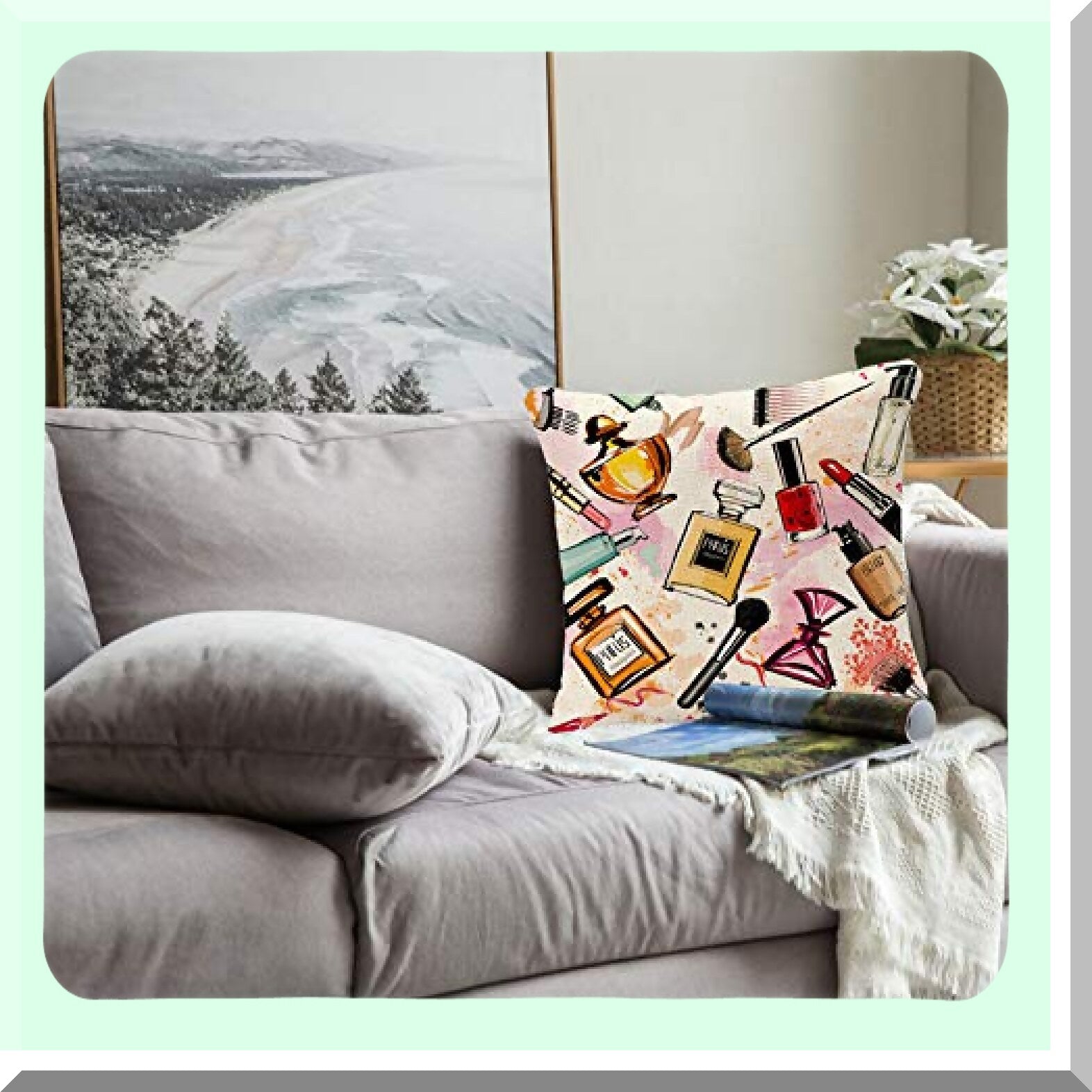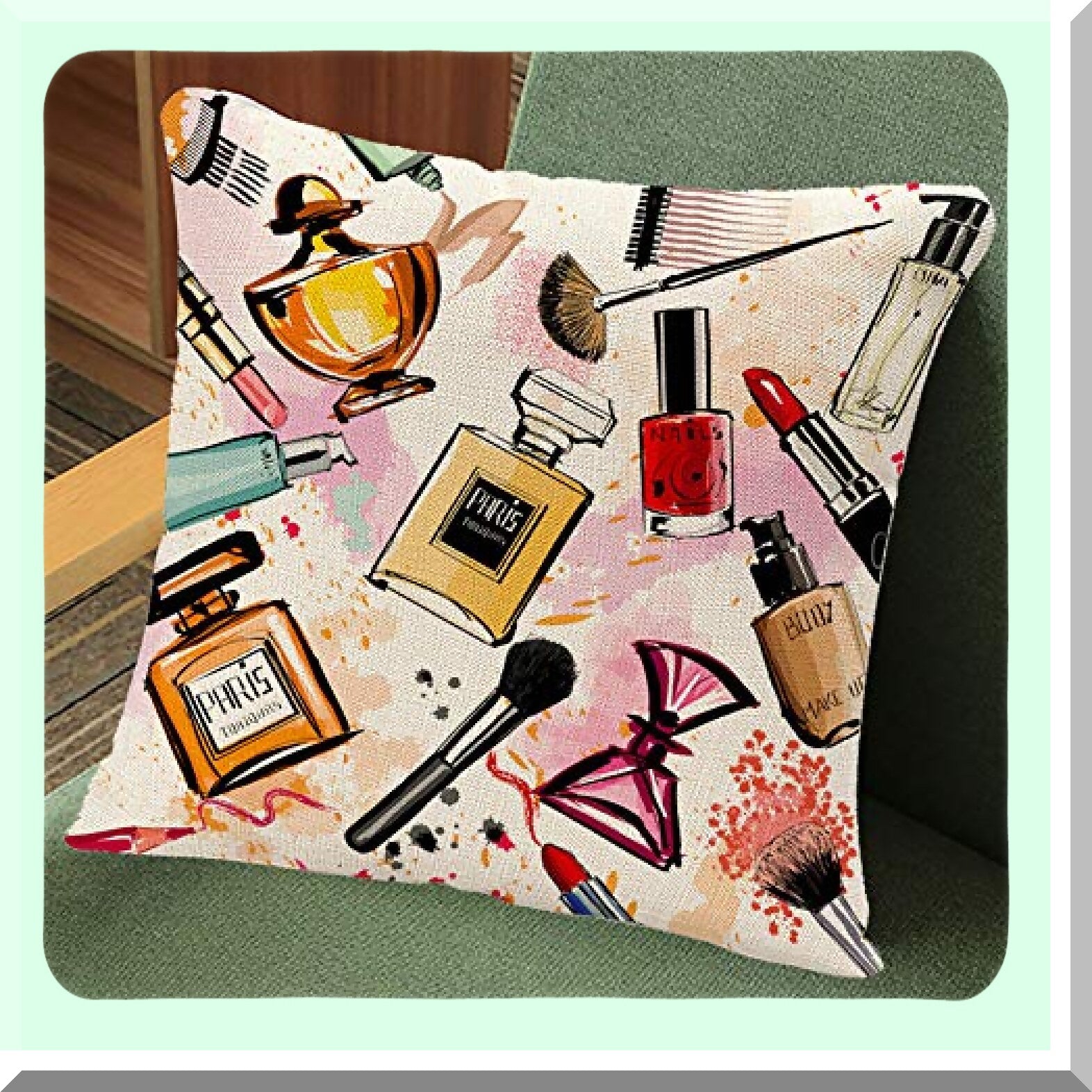 Watercolor Pink Makeup Collection Decorative Pillowcase - Girly Home Decor for Sofa - 18x18 Inches - Cosmetics & Perfumes Theme