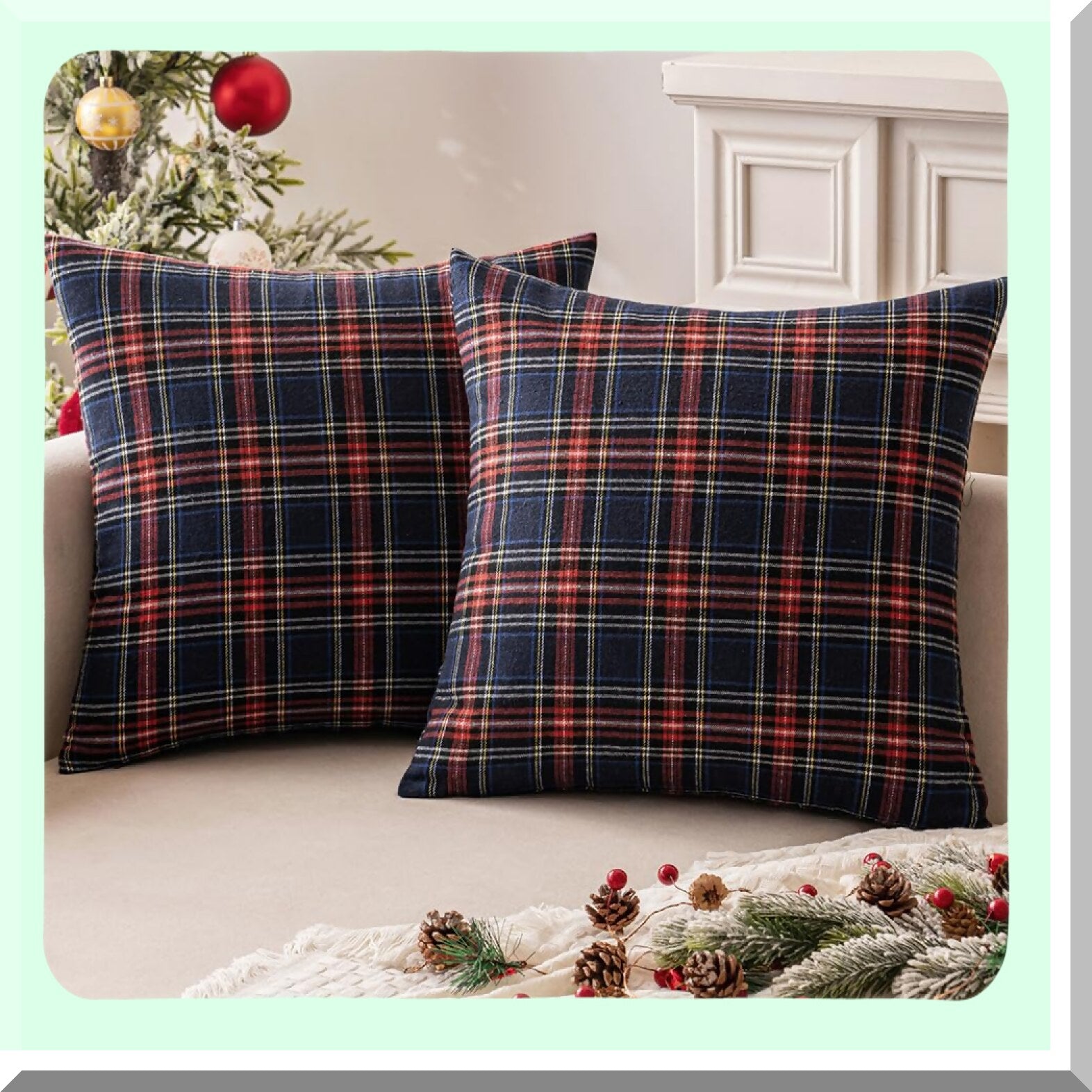 Scottish Plaid Farmhouse Throw Pillow Covers - Set of 2 Decorative Cushion Cases for Sofa Couch, Blue Tartan Square 20x20 Inch