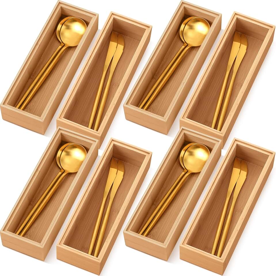 This set includes 8 bamboo drawer organizers designed to keep kitchen utensils and silverware neatly arranged. Each tray measures approximately 9 x 3 x 2 inches, providing ample space for various utensils, cutlery, and small kitchen tools. Made from natural bamboo, these stackable storage boxes are durable and eco-friendly, offering a stylish solution for organizing drawers. The wooden construction ensures stability and a classic appearance, making it easy to customize your storage space. These versatile trays help maximize drawer capacity and maintain a tidy kitchen environment. Suitable for organizing silverware, cooking utensils, or other small items, they are easy to clean and maintain. The stackable design allows for flexible arrangement within drawers, optimizing space and accessibility. Ideal for home kitchens, these bamboo organizers combine functionality with a natural aesthetic, helping to keep your utensils organized and within reach.