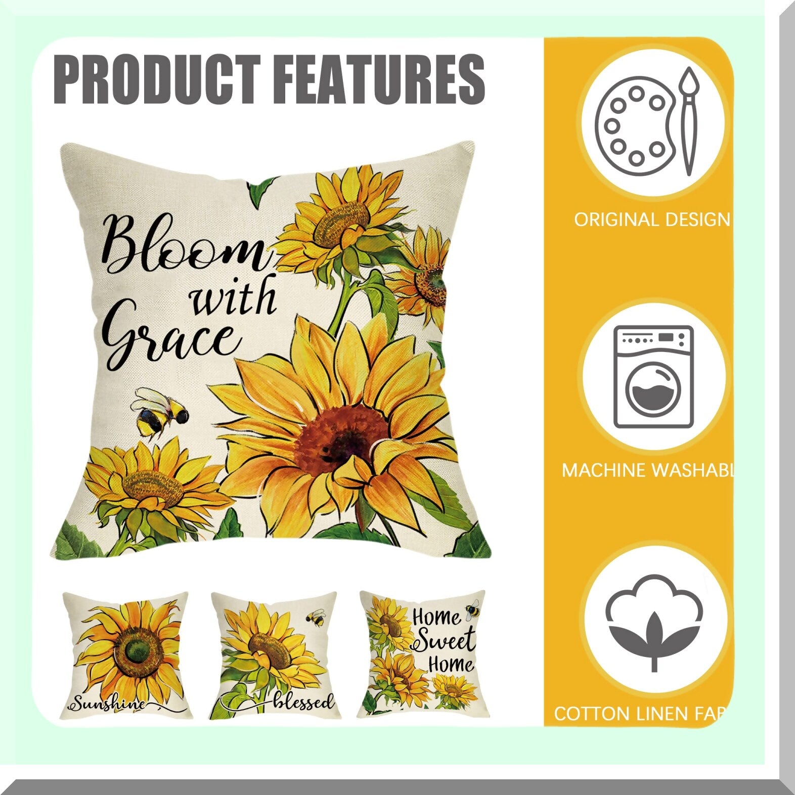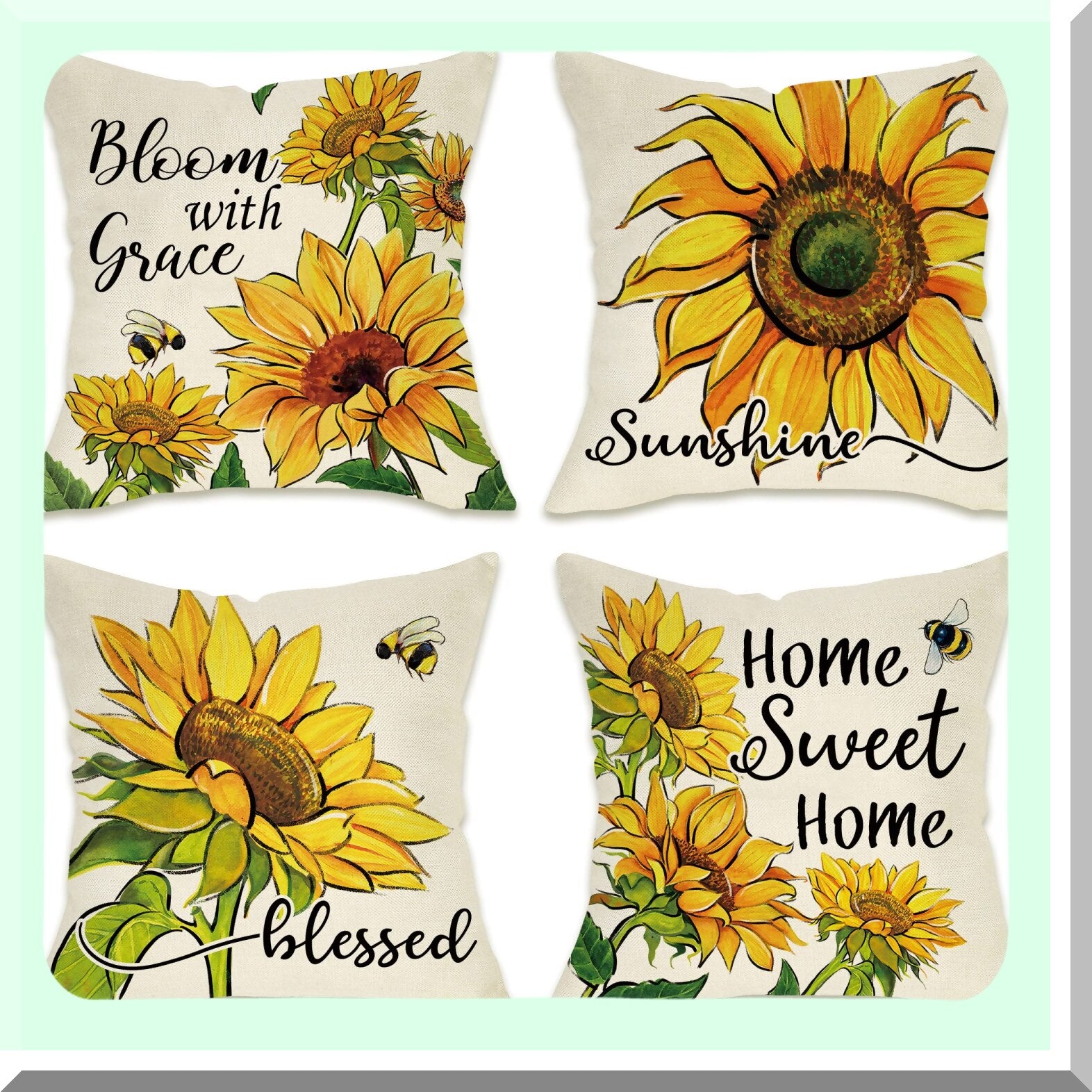 Sunshine Blessings Decorative Pillow Cover Set - Spring Summer Farmhouse Outdoor Cushion Case - Sunflower Flower Home Sweet Home Patio Throw Pillowcase - Fall Autumn Couch Decor 18x18 Pack of 4