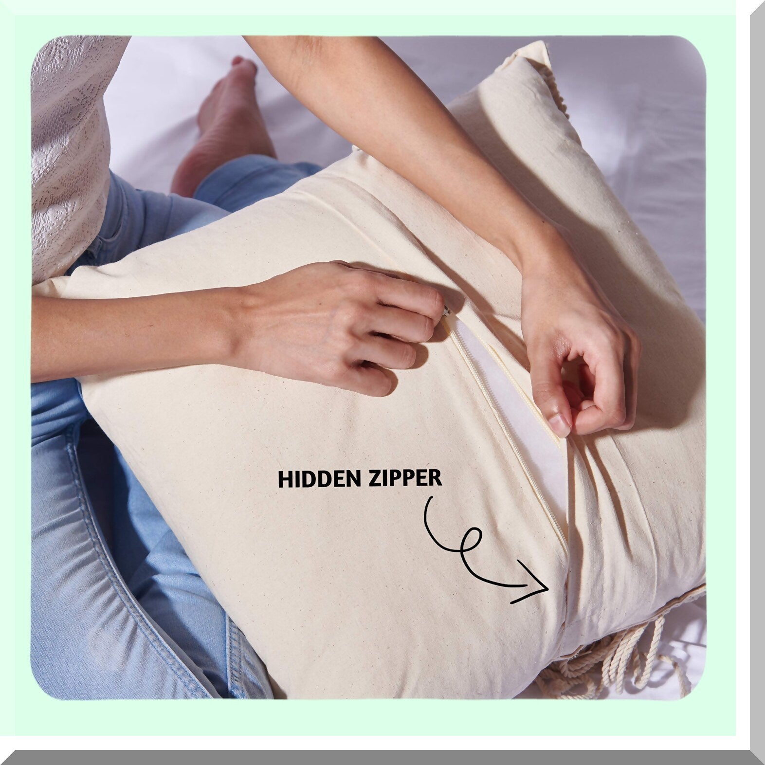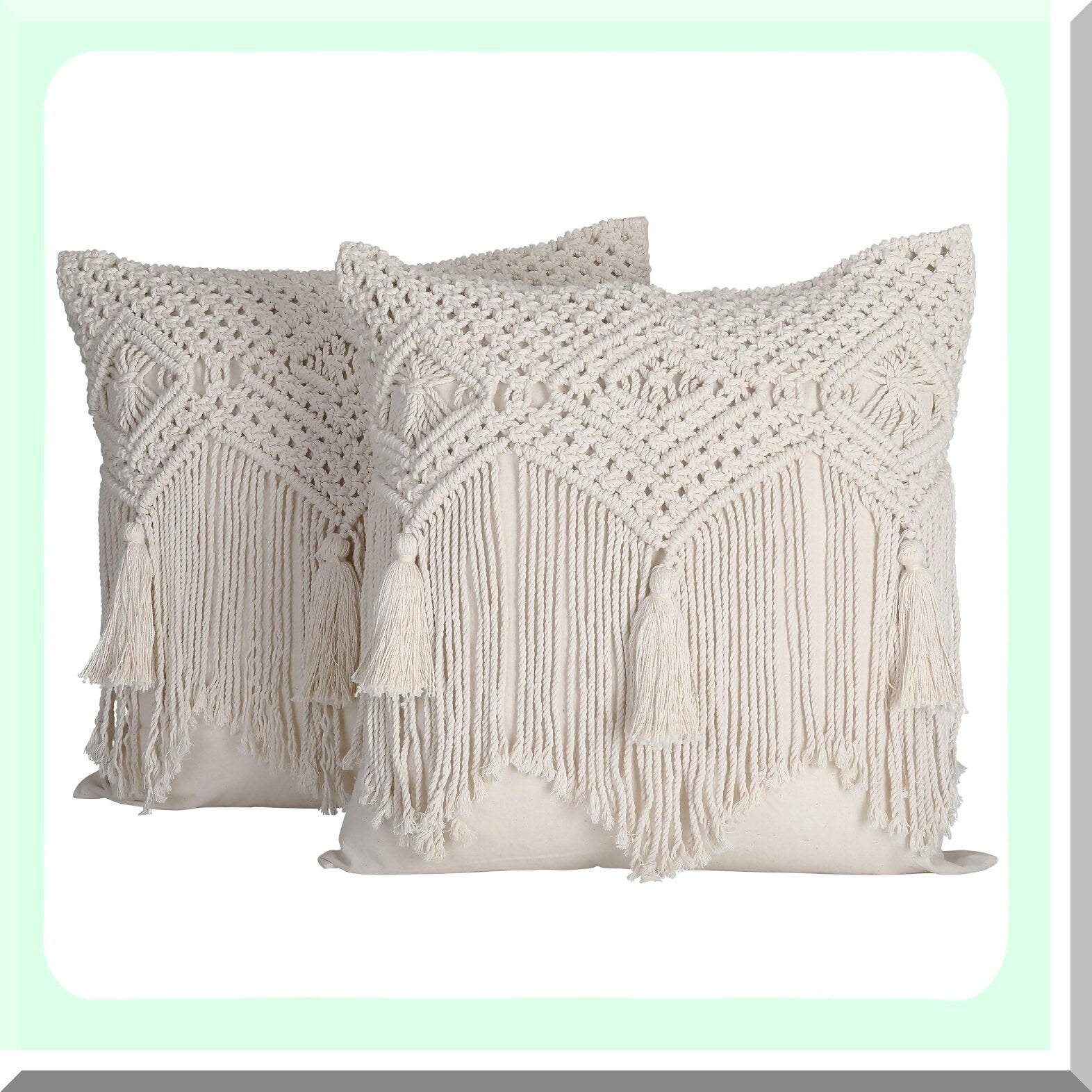 Handcrafted macrame pillow covers made from 100% cotton add a decorative touch to any room. The 16 x 16 inch square covers come in a set of 2 with tassels and a hidden zipper for easy insert removal. Their neutral off-white color complements various decor styles, including boho, farmhouse, and modern. They are machine washable for easy care. The premium soft cotton linen material offers comfort and is safe for children and pets. These pillow covers make a unique gift idea for housewarming, birthdays, and holidays, and are perfect for the living room, bedroom, or office couch.