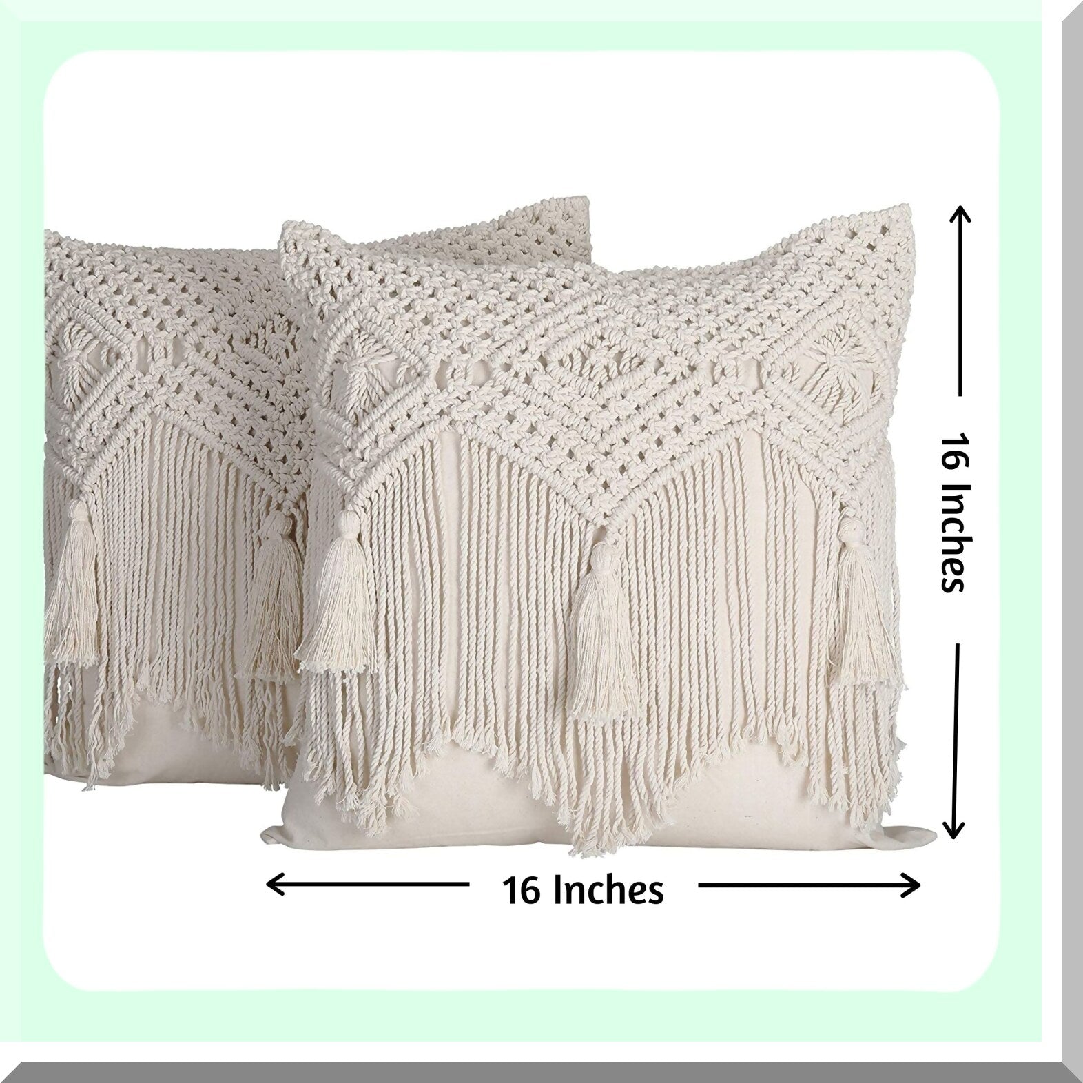 Boho Macrame Farmhouse Pillow Covers - Set of 2, 16X16 Decorative Cushion Cases for Bed, Couch or Sofa with Tels, Natural Off-White Design
