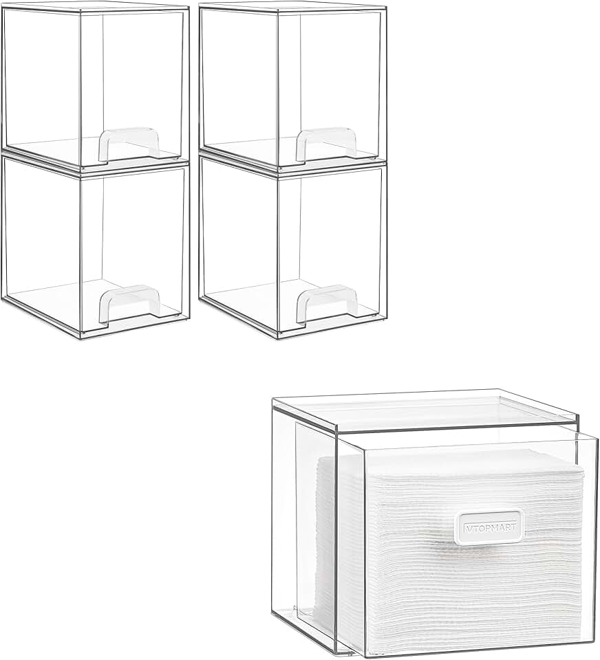 This set includes four clear, stackable storage drawers measuring 7.6 inches in height. Designed for organizing various household items, these drawers are easy to stack and access. The transparent design allows for quick identification of contents, making storage efficient. Suitable for use in kitchens, bathrooms, or offices, they help maximize space and keep belongings tidy. The drawers are durable and lightweight, providing a practical solution for storing facial towels, toiletries, craft supplies, or small accessories. Their stackable feature allows for flexible arrangement to fit different spaces. The design emphasizes simplicity and functionality, making them a versatile addition to any storage system. Easy to clean and maintain, these drawers help keep your environment organized and clutter-free. Ideal for those seeking a straightforward way to manage small items and enhance space utilization in various settings.