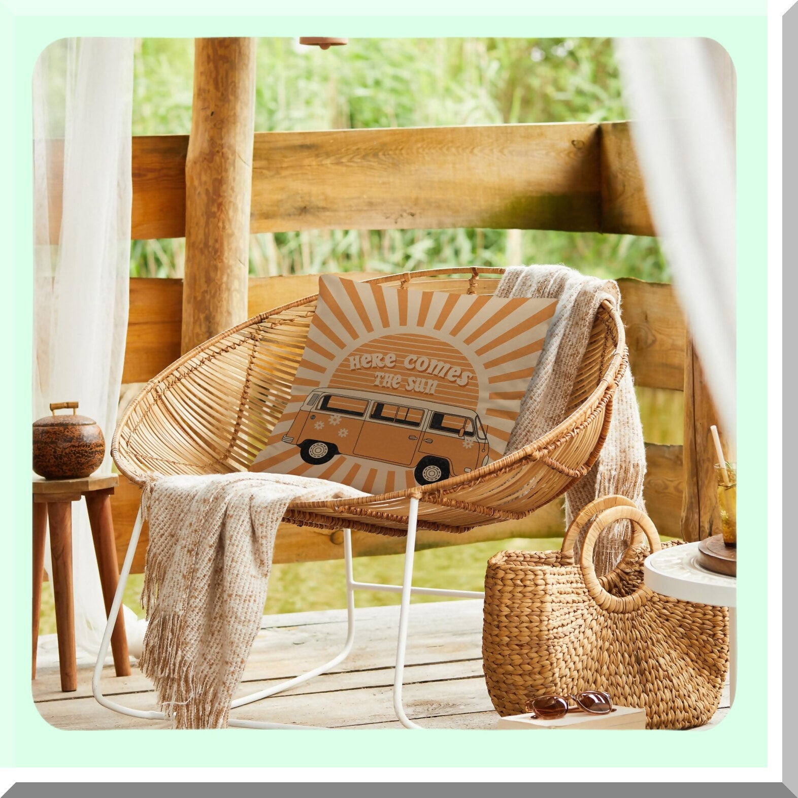 Boho Vintage Sunshine Reversible Throw Pillow Cover - Retro Hippie Orange Sun Floral Bus - Home Living Room Decor for Women Teen Girls - 18x18 inches Gift