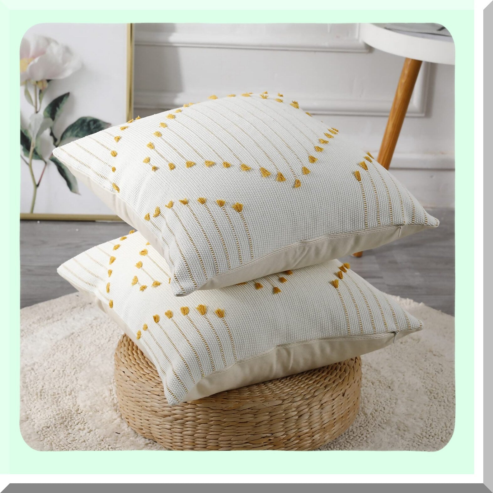 Boho Tufted Throw Pillow Covers - 18x18 inch Decorative Bohemian Cushion Case for Couch, Sofa, Living Room, Car - Farmhouse Yellow & Cream White Square Pillowcase