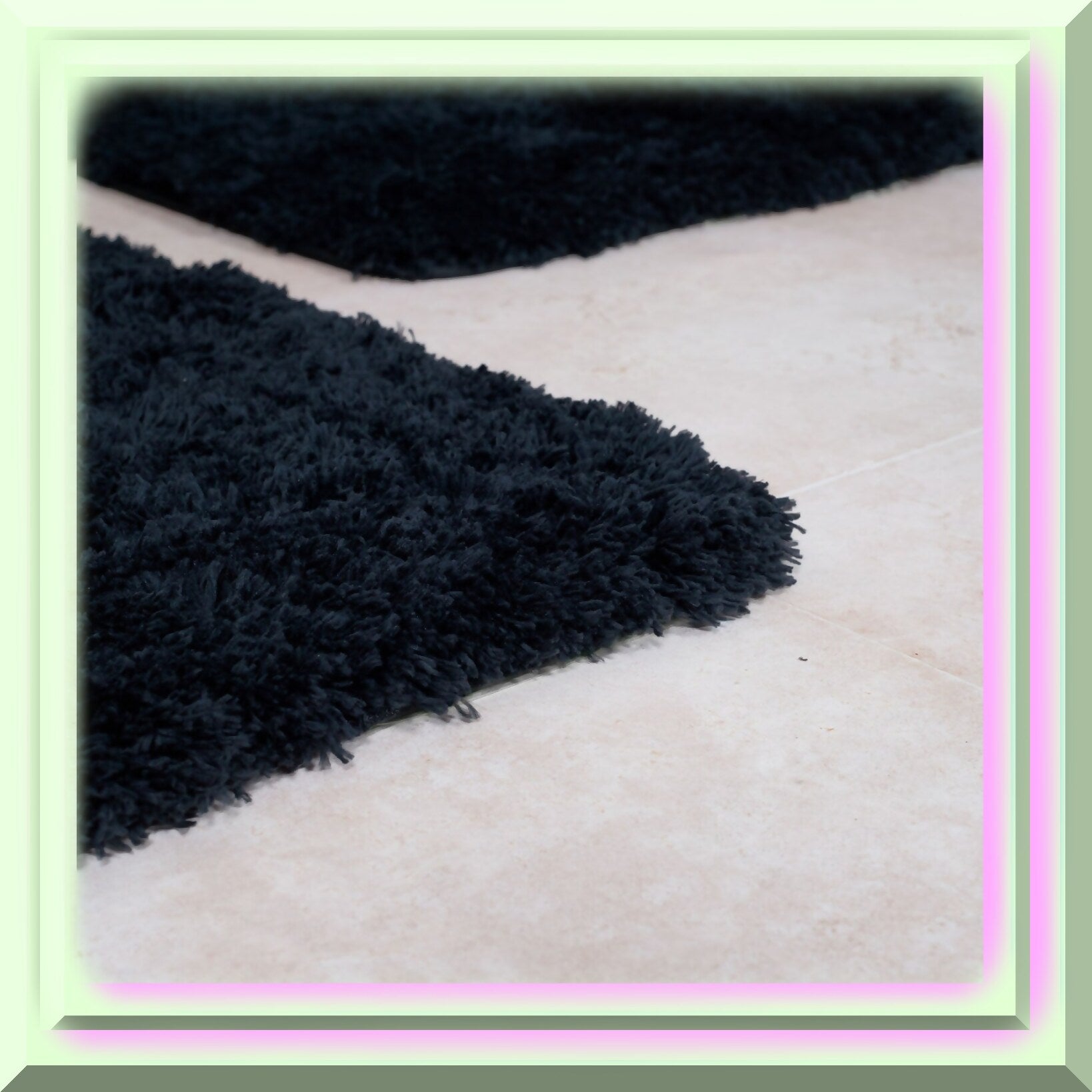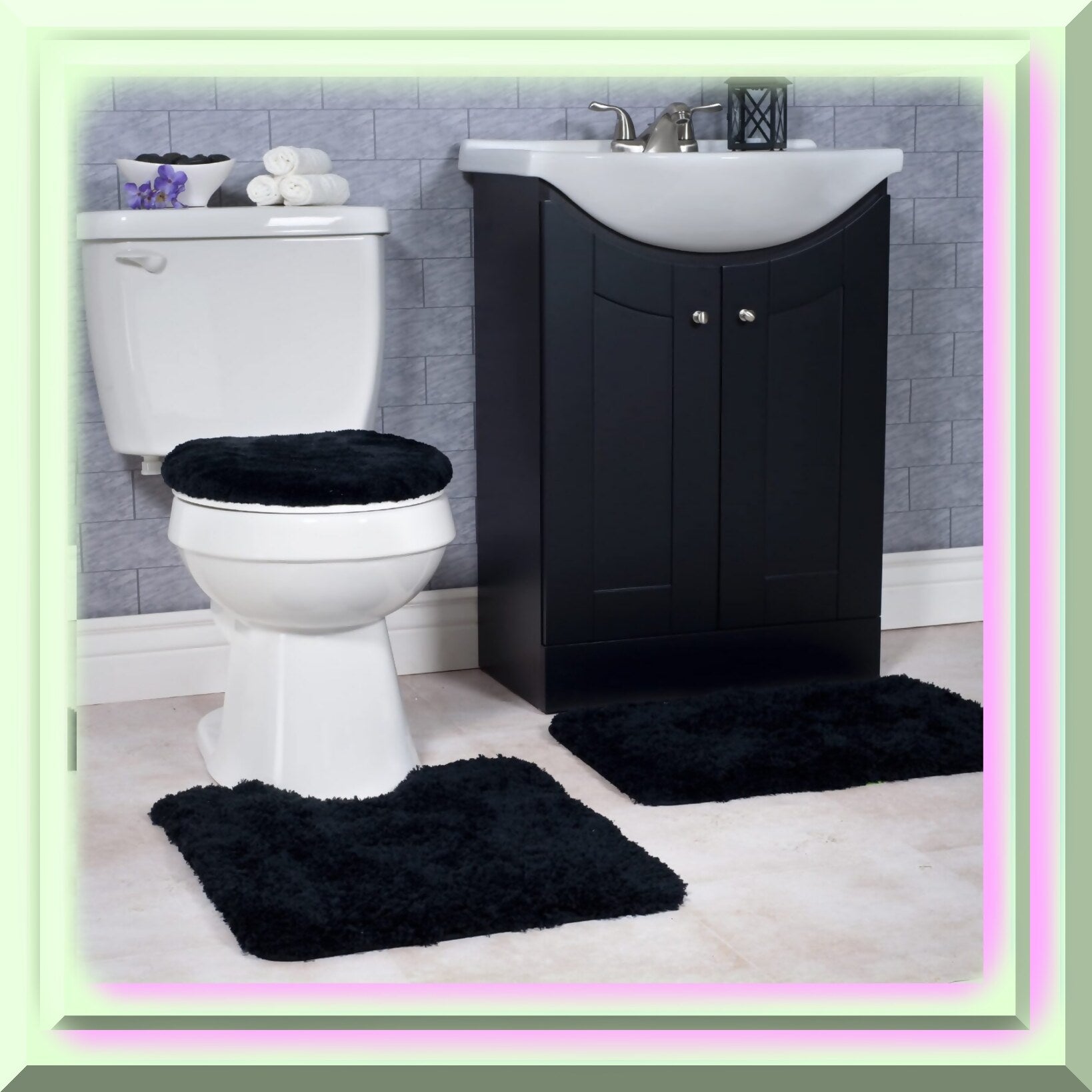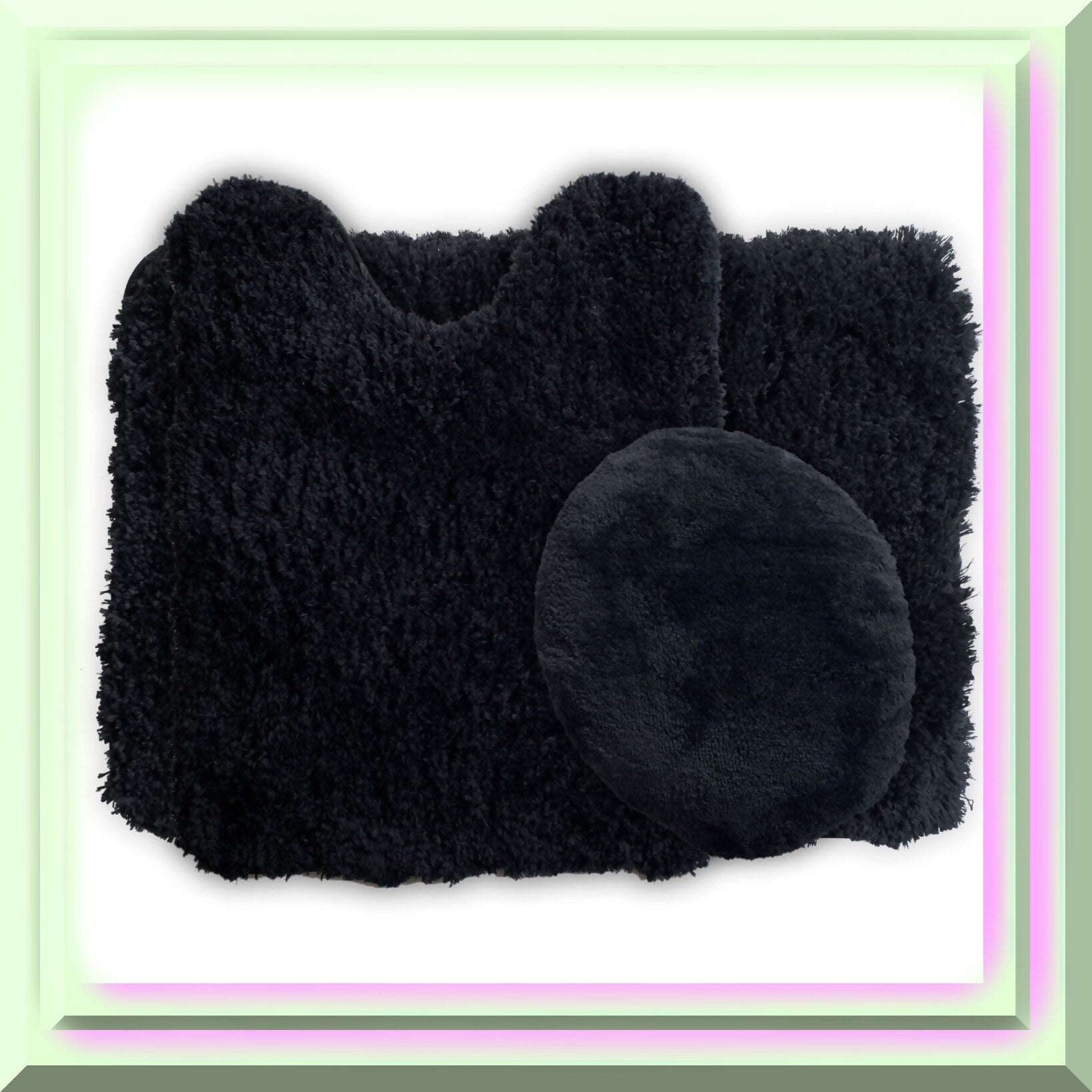 Enhance your bathroom with this 3 Piece Super Plush Bath Rug Set in black. The set includes a bath mat measuring 24" x 17" x 1", a contour mat designed to fit around most standard toilets with a 9" opening, and a lid cover for added comfort and protection. Crafted from 100% polyester fabric, these rugs feature a super plush texture that feels soft underfoot, providing a luxurious step out of the shower or bath. The non-skid bottom ensures safety on wet surfaces. The contour rug is tailored to fit around most toilets, while the lid cover adds a finishing touch of comfort and protection. Easy to maintain, this set is machine washable, making it convenient to keep clean. With its sleek black color, it adds a sophisticated look to any bathroom decor. Dimensions: Bath Mat – 24" L x 17" W x 1" H; Contour Mat – 24" L x 19".