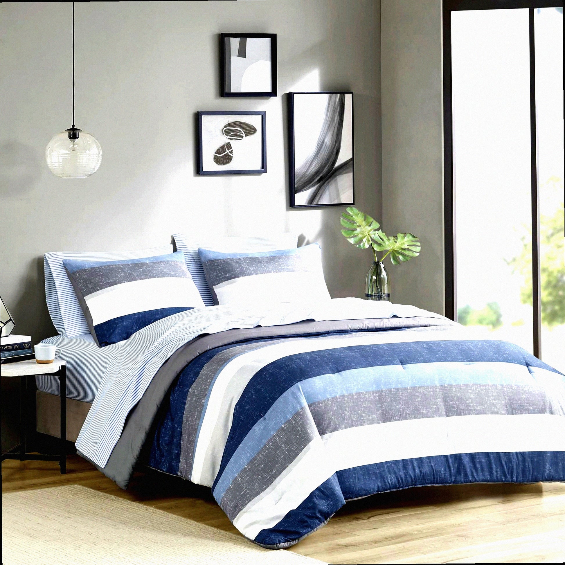 Elevate your bedroom decor with the Jaxon bed in a bag set, featuring a stylish stripe design in shades of grey, navy, and blue. This set includes a cozy comforter, soft sheets, and pillowcases for a complete look. Crafted from ultra-fine microfiber, this bedding is lightweight, durable, and perfect for year-round comfort. The OEKO-TEX label ensures it's safe for you and the environment. With generous sizing and easy care instructions, this set is a must-have for a casual and modern bedroom style. Say goodbye to boring bedding and hello to a fresh new look with the Jaxon bed in a bag set.