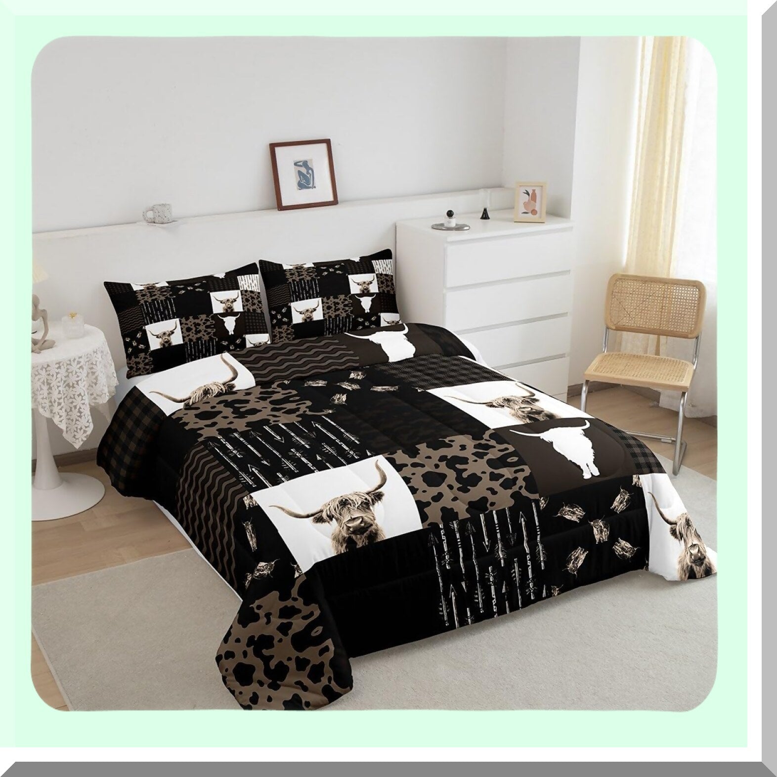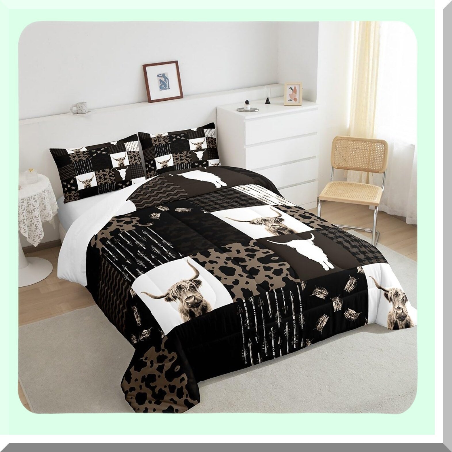 Rustic Farmhouse Cow Print Comforter Set - Highland Cattle Duvet Quilt - Retro Country Style Bedding - Twin Size with 1 Pillowcase