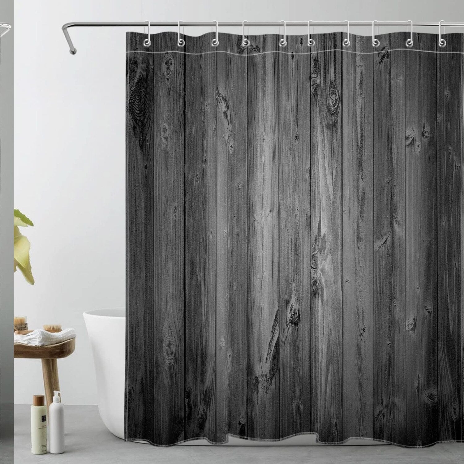 This farmhouse grey wood shower curtain measures 60 inches wide by 72 inches high, crafted from waterproof polyester fabric that dries quickly and requires no liner. Featuring ten holes and hooks included, it is easy to install and suitable for various spaces beyond the bathroom, such as doors, kitchens, windows, or as wall art, photo backdrops, or party decor. Its vintage western country rustic wood board design adds a charming touch to any setting, helping to prevent water spray during showers while providing privacy. The curtain's medium thickness ensures durability without being too thin or thick. It is available in multiple themed styles, including cute animals, underwater scenes, tropical plants, beach themes, sports, watercolor art, and more, offering versatile options for different tastes and occasions. A thoughtful gift idea for loved ones, this decorative curtain enhances bathroom aesthetics and functionality, combining style with practicality.