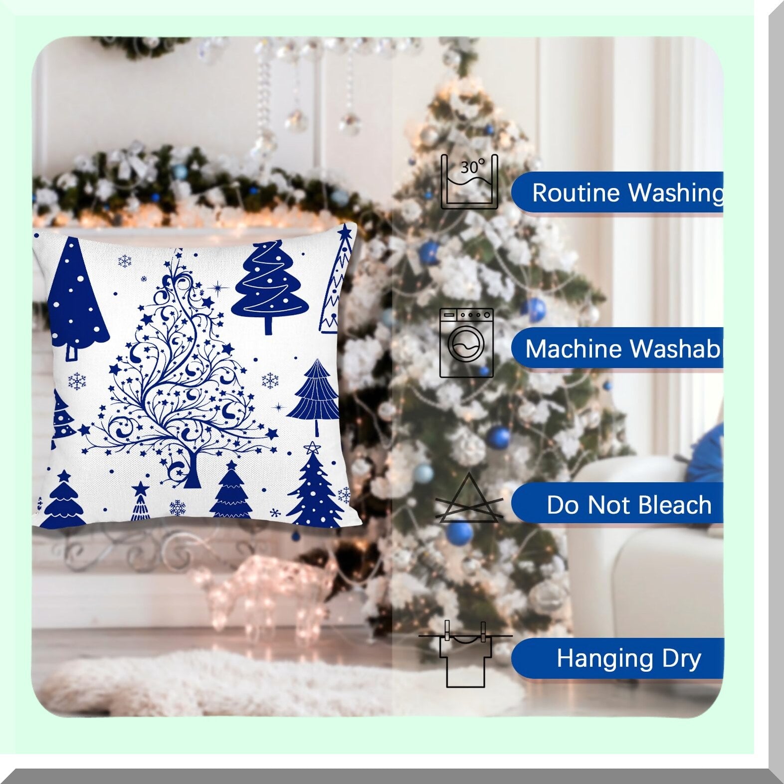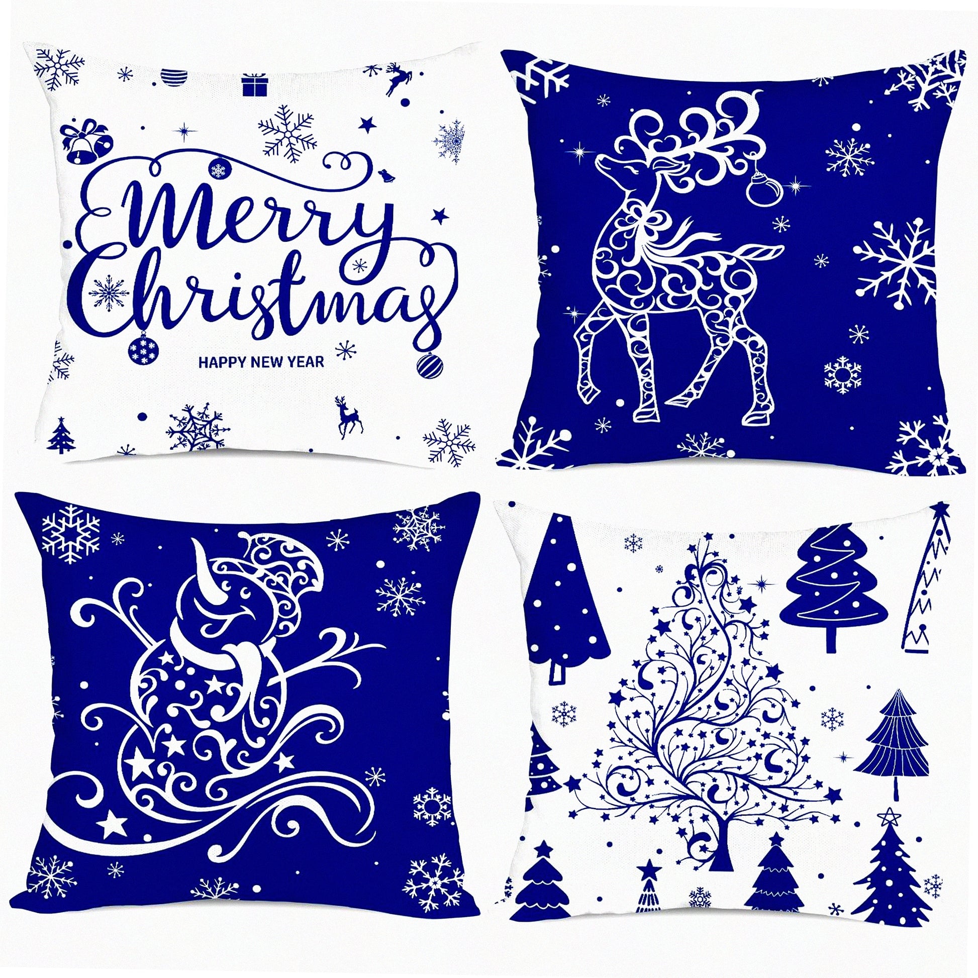 Winter Wonderland Holiday Pillow Covers - Set of 4 Blue Throw Pillow Covers 20x20 with Trees, Deer, Snowman & Merry Decor for Farmhouse Decoration