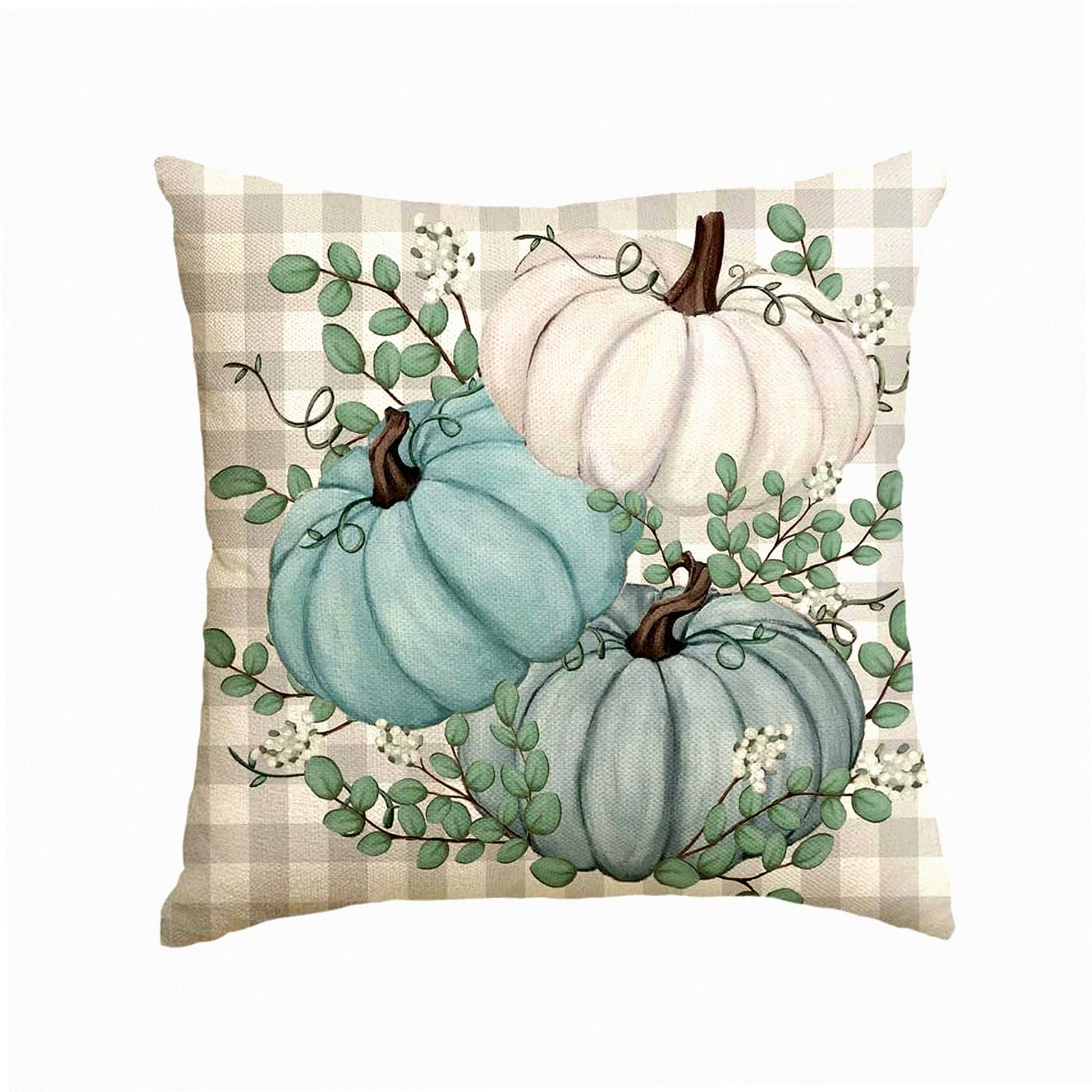 Plaid Pumpkin Eucalyptus Harvest Throw Pillow - Fall Autumn Thanksgiving Decor - 18x18 Inch Sofa Couch Cover - Home Decoration