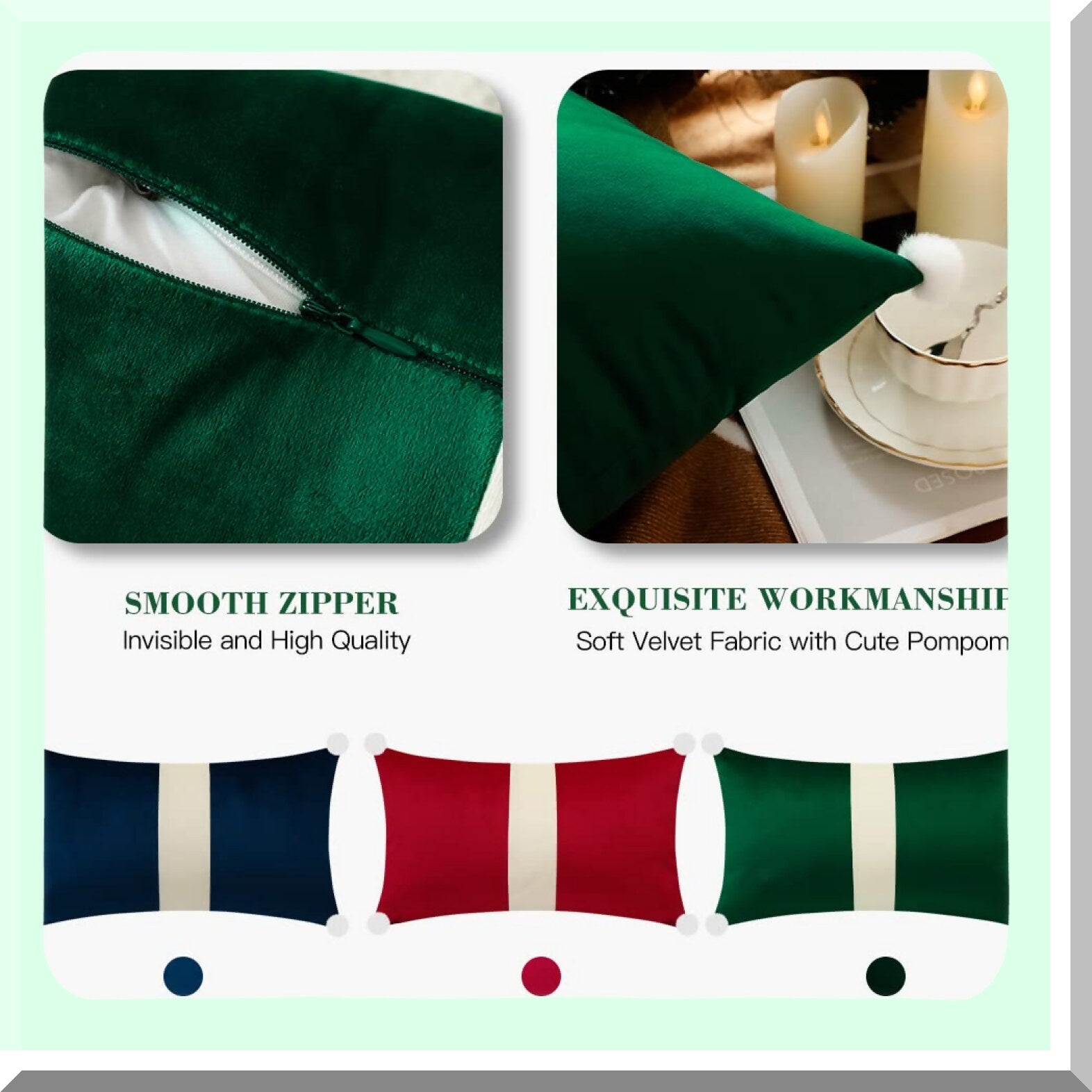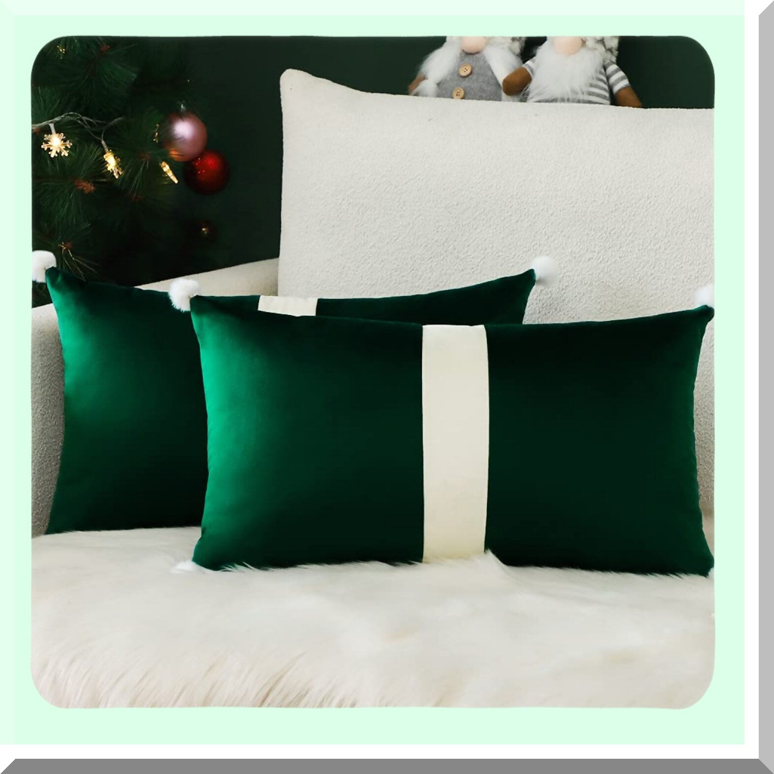 Luxury Velvet Pom-Pom Lumbar Pillow Covers - Beige Green Patchwork Decorative Throw Cushion Cases for Sofa Bed - Set of 2 - 12X20 Inches
