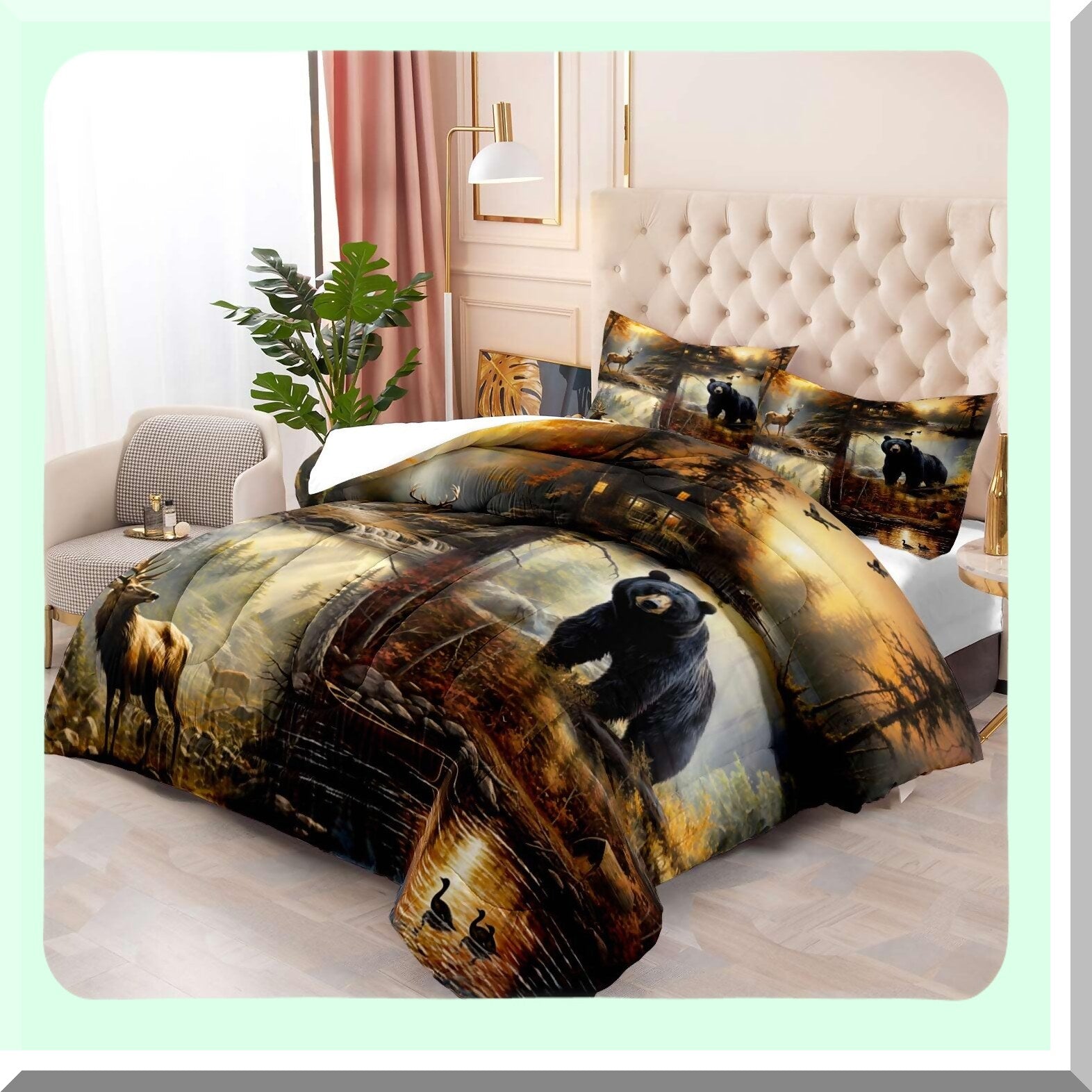 Wildlife Hunter Lodge Comforter Set - Black Bear Deer Elk Moose Mallard Duck Woodland Forest Animal Rustic Farmhouse Cabin Bedding - 3PCS with 2 Pillow Shams