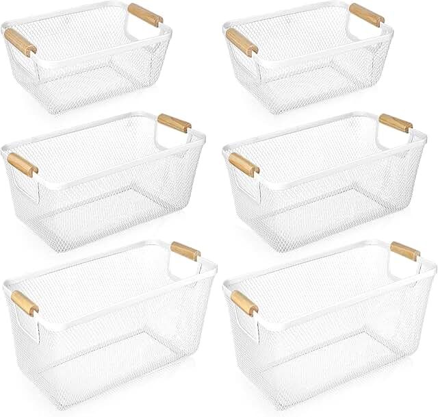 The Maxcheck 6 Pack includes three sizes of metal wire baskets with wooden handles, designed for versatile storage and organization. These steel mesh bins are suitable for use in home cabinets, closets, kitchens, and freezers. Their durable construction provides a sturdy solution for storing food, fruits, or other household items. The rectangular shape allows for efficient use of space, and the wooden handles add a touch of style and ease of handling. Ideal for keeping spaces tidy and organized, these storage containers are practical for everyday use. The set offers a convenient way to categorize and access items quickly, making them a useful addition to various areas in the home. Their simple design and reliable materials ensure long-lasting performance, helping to maintain a neat and clutter-free environment.
