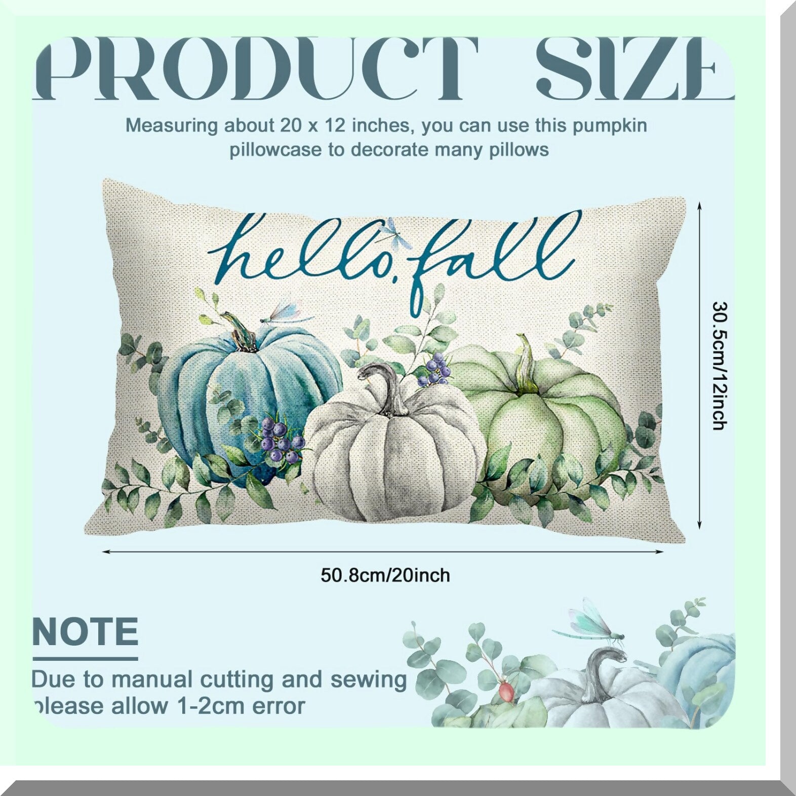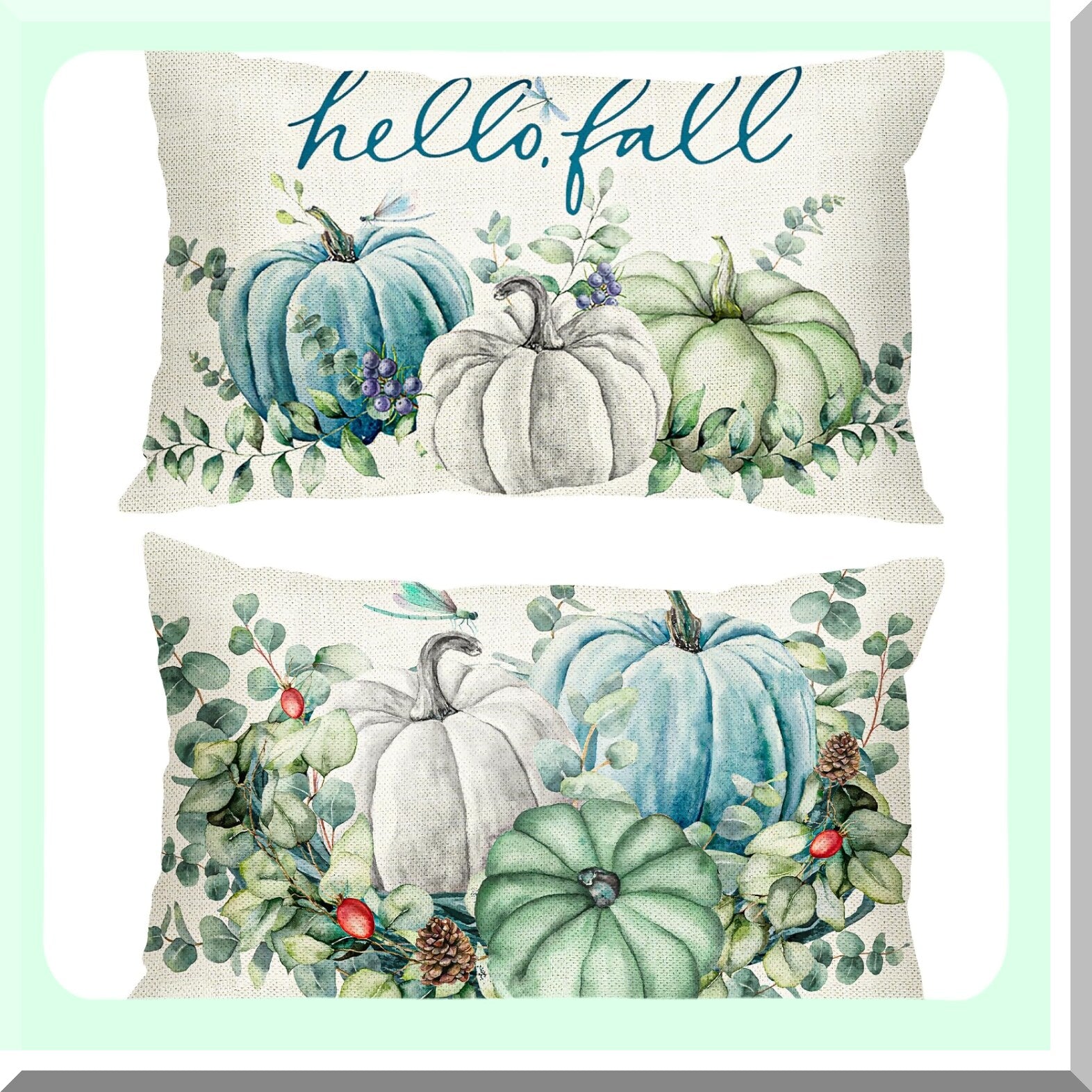 Fall Harvest Lumbar Pillow Set - Teal Blue Pumpkins & Eucalyptus Leaves Cushion Covers - Autumn Decor for Thanksgiving - 12x20 Inch Cozy Throw Pillows