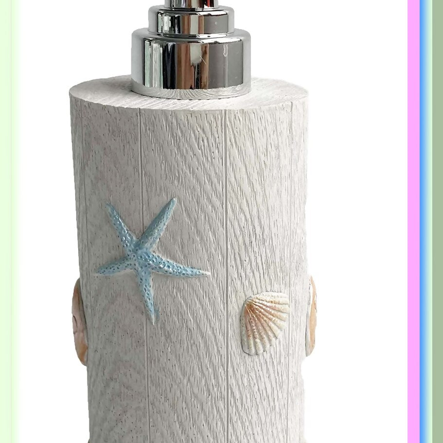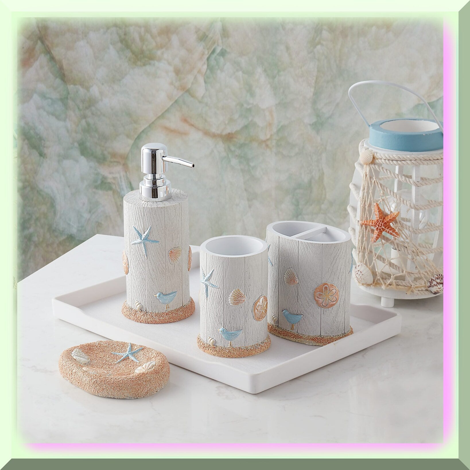 This 4-piece bath accessories set includes a liquid soap dispenser, soap dish, toothbrush holder, and tumbler, all designed to enhance your bathroom decor. The soap dispenser features a durable pump with anticorrosive and anti-tarnishing electroplating technology, allowing one-handed operation and automatic rebound to prevent leaks. The soap dish is designed with drainage to extend soap life. The toothbrush holder cup provides a stable base with enough space for two toothbrushes and a tube of toothpaste. The tumbler is ergonomically designed for comfortable handling. Suitable for various spaces such as master bathrooms, guest rooms, kitchens, or vacation homes, this elegant set adds a nautical beach bohemian style with blue starfish, seashells, conchs, and trumpet shells on a white base, creating a summer ocean environment. Perfect as a gift for family and loved ones, it suits birthdays, holidays, or any special occasion.
