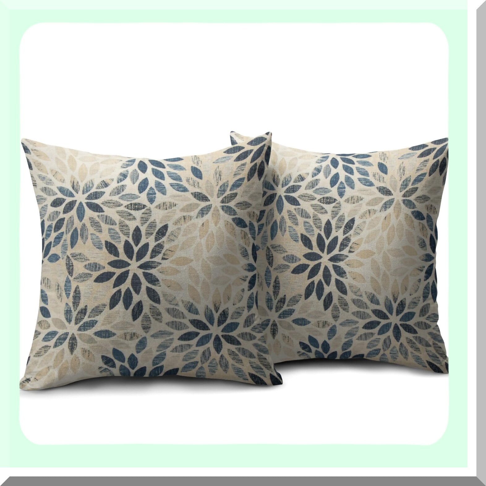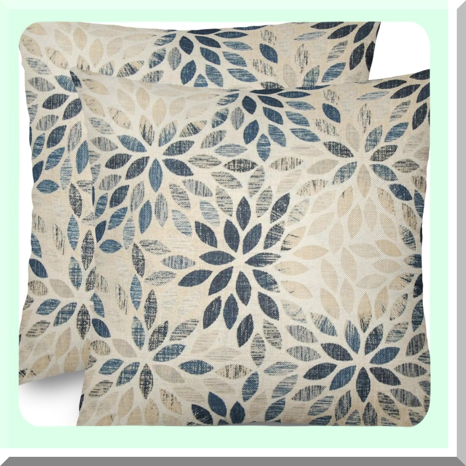Rustic Floral Linen Pillow Covers Set - Navy Blue Beige Dahlia 18x18 - Geometric Flower Outdoor Decorative Throw Pillows - Farmhouse Cushion Case for Home Sofa Bed - Summer Cream Decor