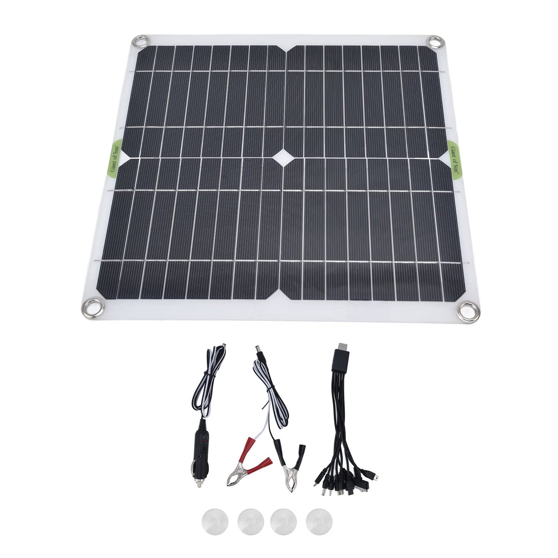 The Portable Solar Panel comes equipped with a USB output, allowing you to charge smartphones, tablets, and other USB-compatible devices effortlessly. The package includes four suction cups for secure mounting, a car charger for on-the-road convenience, a crocodilian clip for versatile attachment options, a data line for easy connectivity, and a user manual to guide you through setup and usage.
