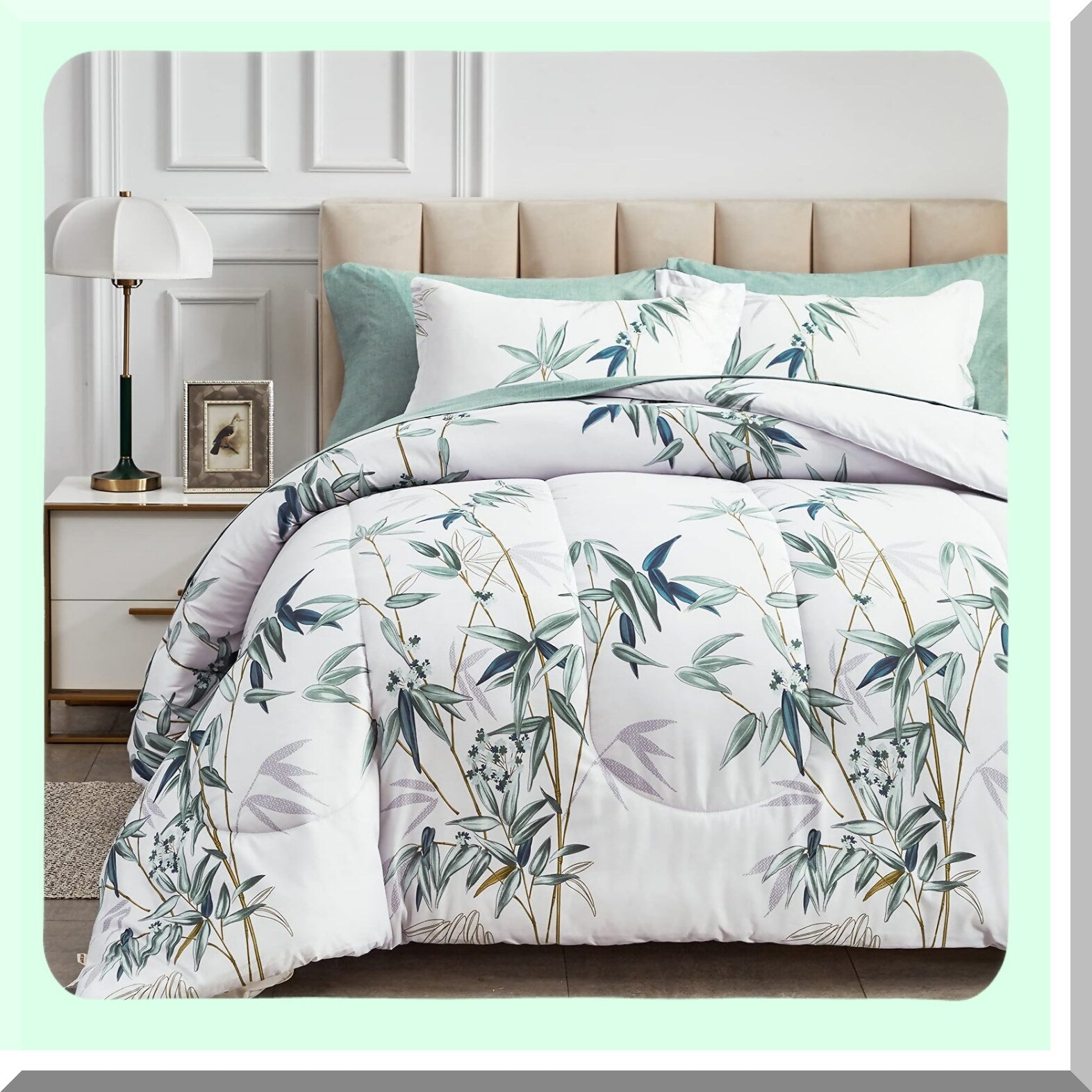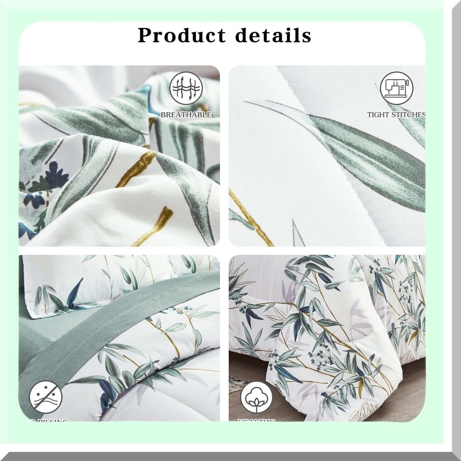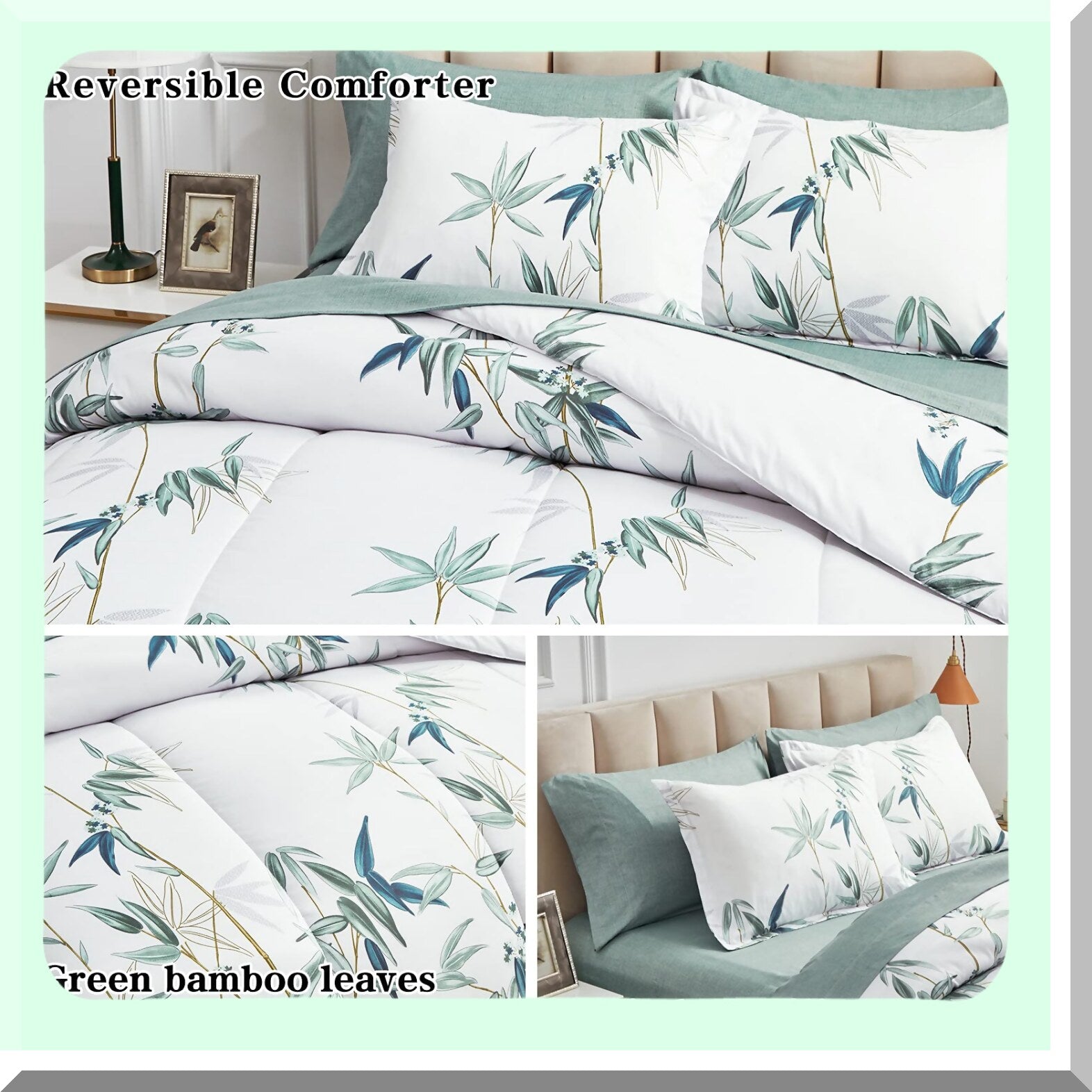 Green Leaf Botanical Bedding Set - 7 Piece Queen Comforter Set with Sheets - All Season Bed in a Bag - White Design - 1 Comforter, 2 Shams, 1 Flat Sheet, 1 Fitted Sheet, 2 Pillowcases