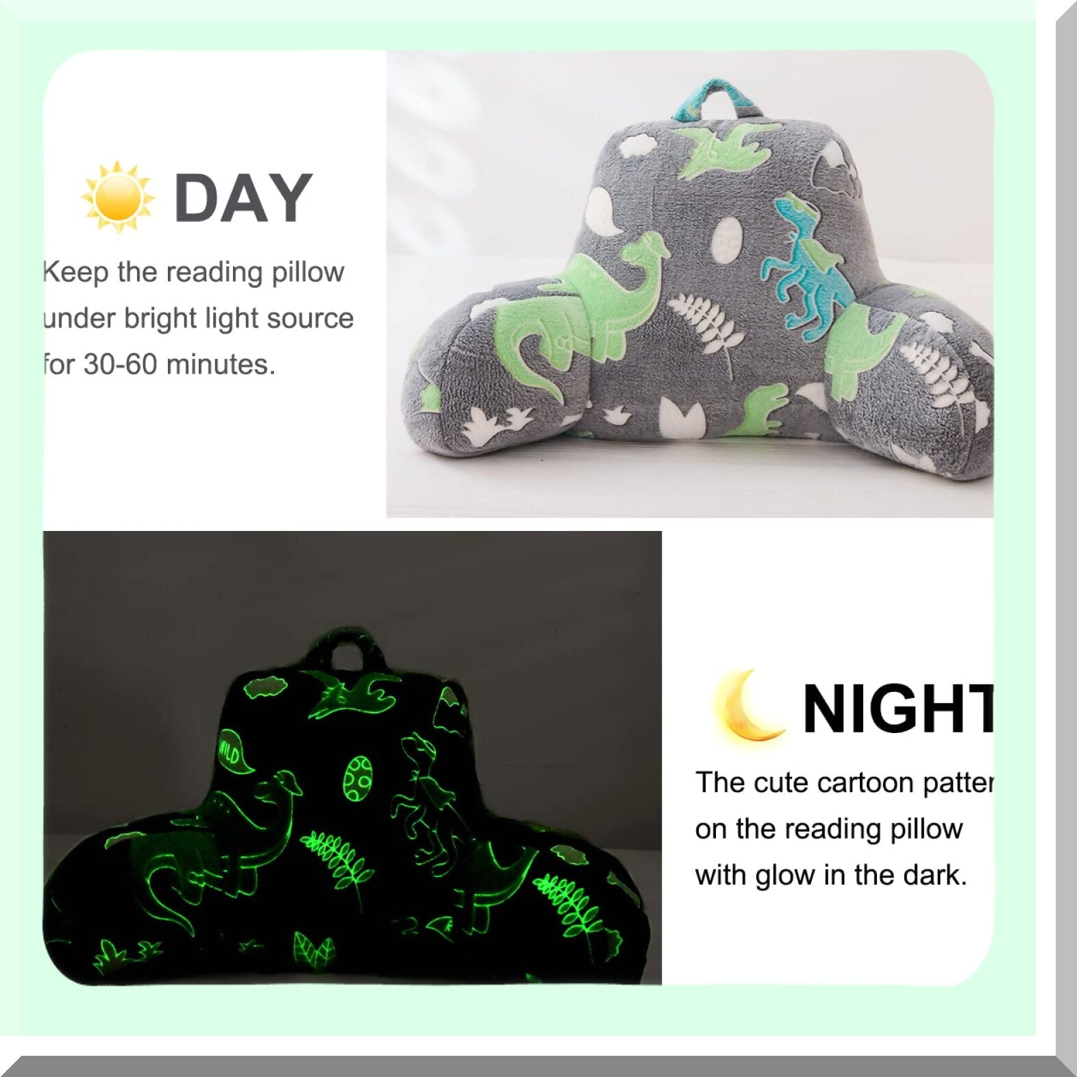 Glow Dino Reading Pillow - Lumbar Support Cushion for Teens & Kids - Glitter Green Bed Rest with Arms - Neck & Lower Back Comfort - Boys & Girls