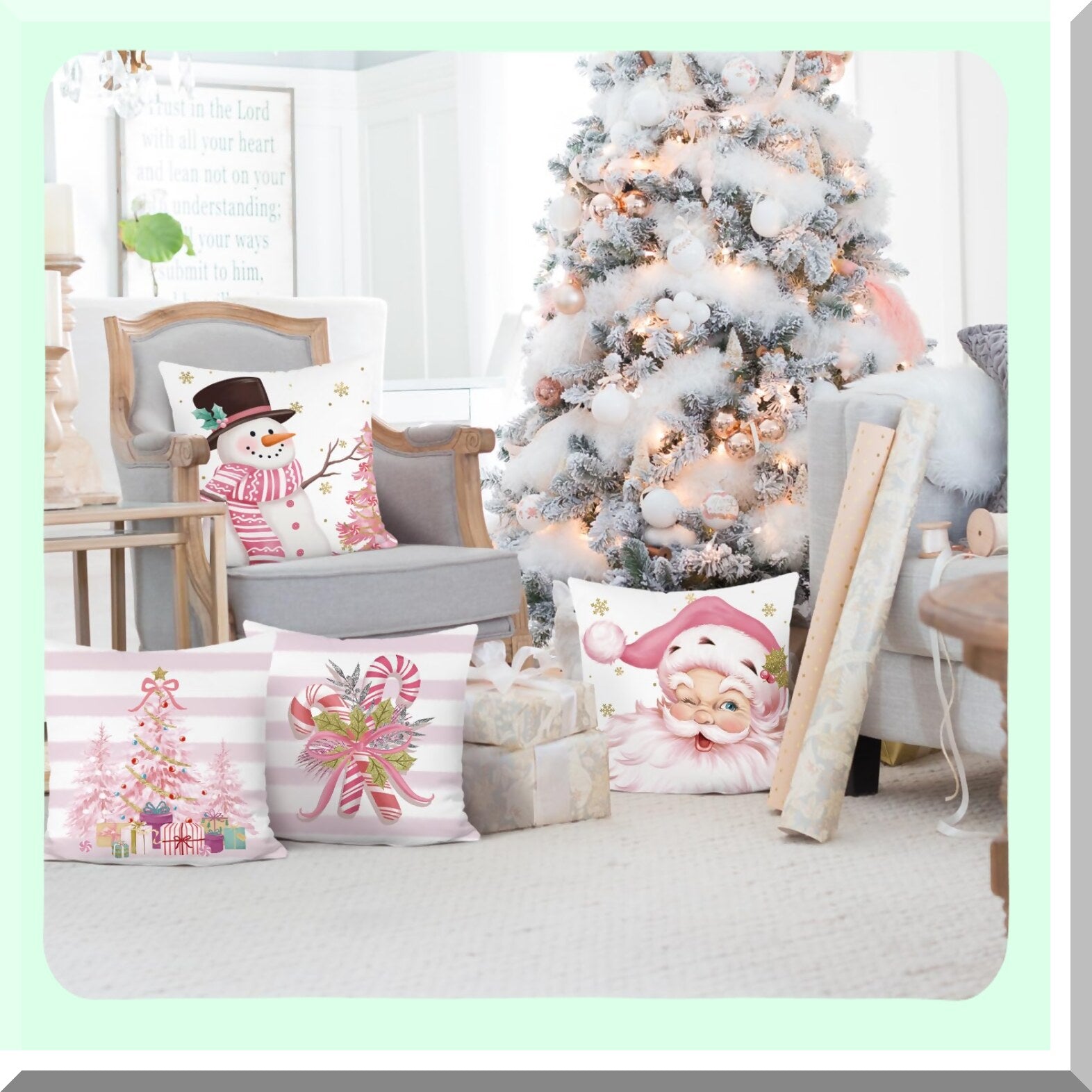 Winter Wonderland Holiday Pillow Covers - Set of 4 Festive Christmas Decorative Cushion Cases for Couch, Sofa, Bed - Pink Snowman Candy Cane Xmas Tree Design - 18x18 Inch