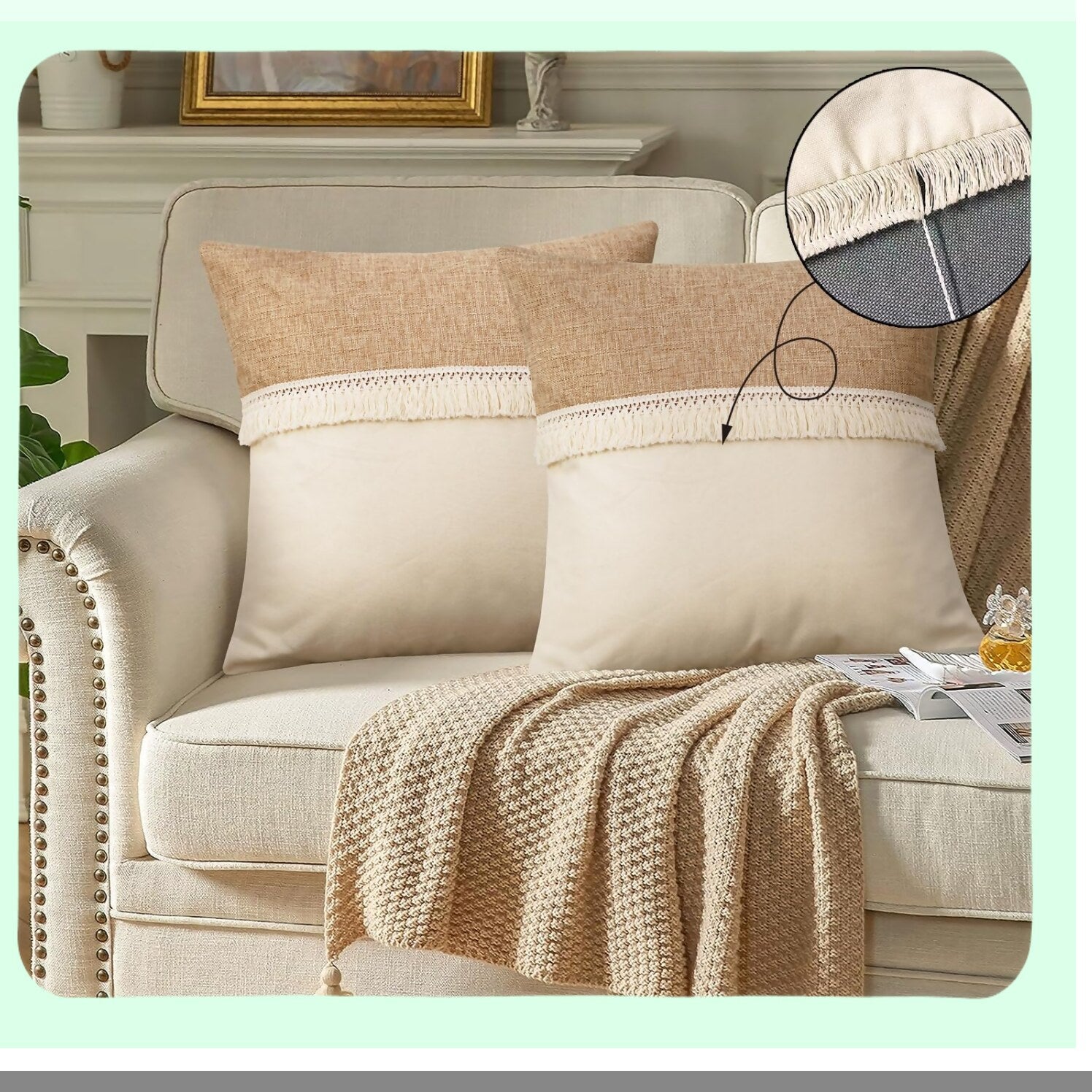 Boho Linen Patchwork Farmhouse Cushion Covers - Natural Linen Pillow Shell with Tel Trim - Decorative Sofa Bedroom Pillow Covers