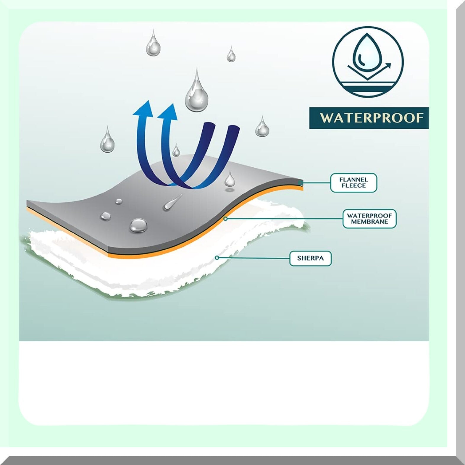 Introducing the Premium Waterproof Sherpa Blanket - the ultimate solution for all your home needs! Our blanket is 100% waterproof, ensuring no leaks from one side to the other. With plush fleece on one side and thick sherpa lining on the other, you can stay dry and cozy. Made with 460 GSM of premium microfiber polyester, this blanket is soft, lightweight, and durable. Available in 4 colors to match your home decor perfectly. Use it at home, in the car, or even outdoors! Machine washable for easy care. Our vision is to provide comfort you can trust, with innovative products that enrich your life. Explore our extensive line of throws and blankets, featuring practical designs like arm sleeves for ultimate relaxation. Upgrade your home with our premium fabrics and stylish patterns - experience the difference with our Waterproof Sherpa Blanket!