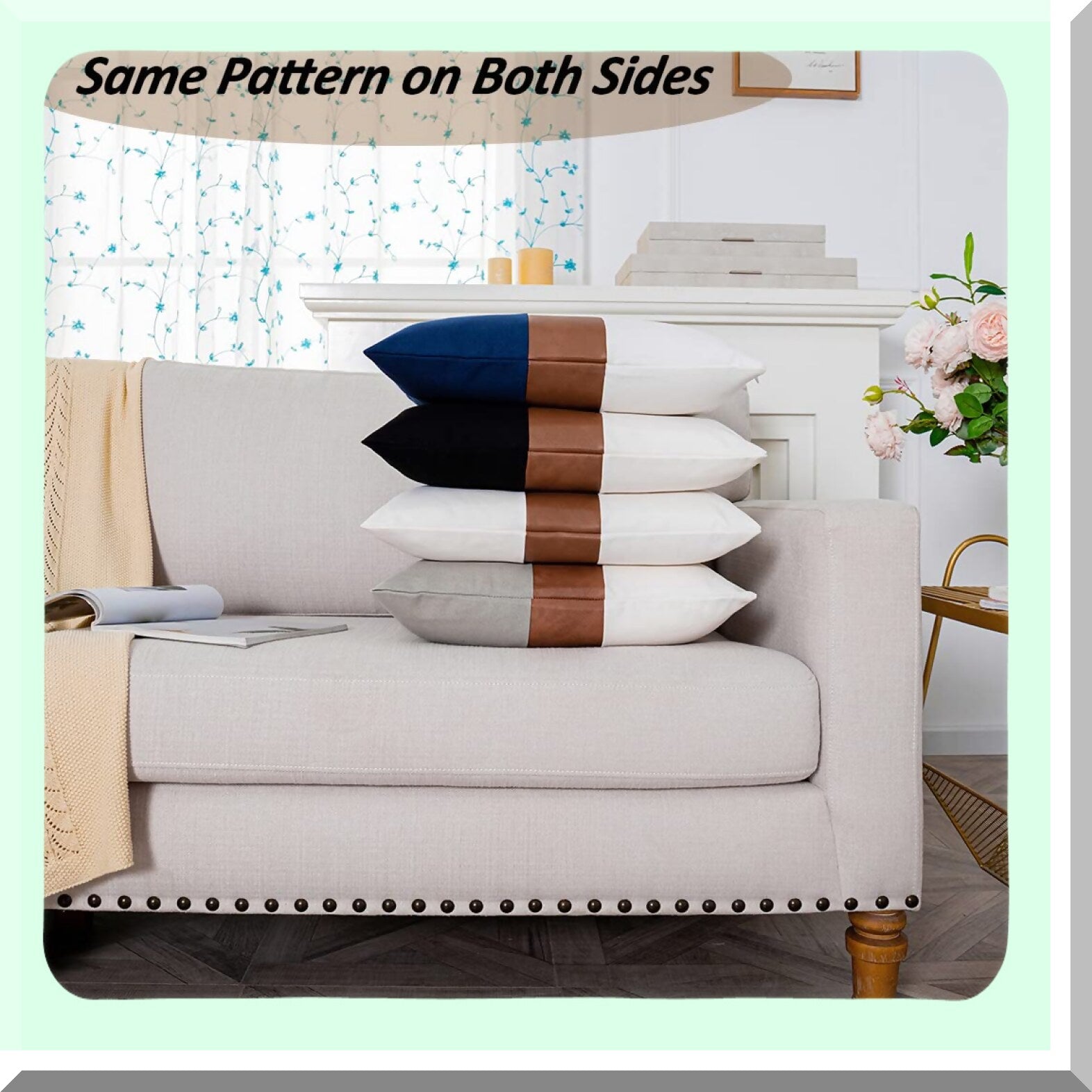 The soft canvas throw pillow cover with leather decoration enhances the appearance of your couch, making it look amazing and chic. It serves as a highlight for your sofa, adding a stylish touch to home decor. The product includes two 18x18 inch pillow covers and two 12x20 inch pillow covers, made from cotton and leather with an invisible zipper closure. Practical benefits include easy hand washing and natural drying, ensuring maintenance is simple and convenient for users.