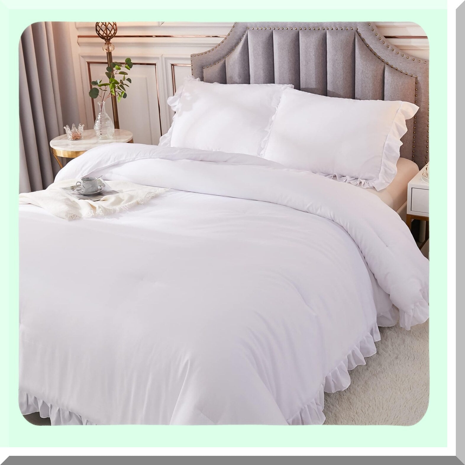 Indulge in luxury with our 3-piece white comforter set, featuring a stunning ruffled design. This set includes a generously sized ruffled comforter and two matching pillowcases, perfect for adding a touch of elegance to any bedroom. Available in a California King size, this set makes a thoughtful gift for loved ones on special occasions. Surprise your friends and family with the gift of comfort and style with our ruffle comforter set.